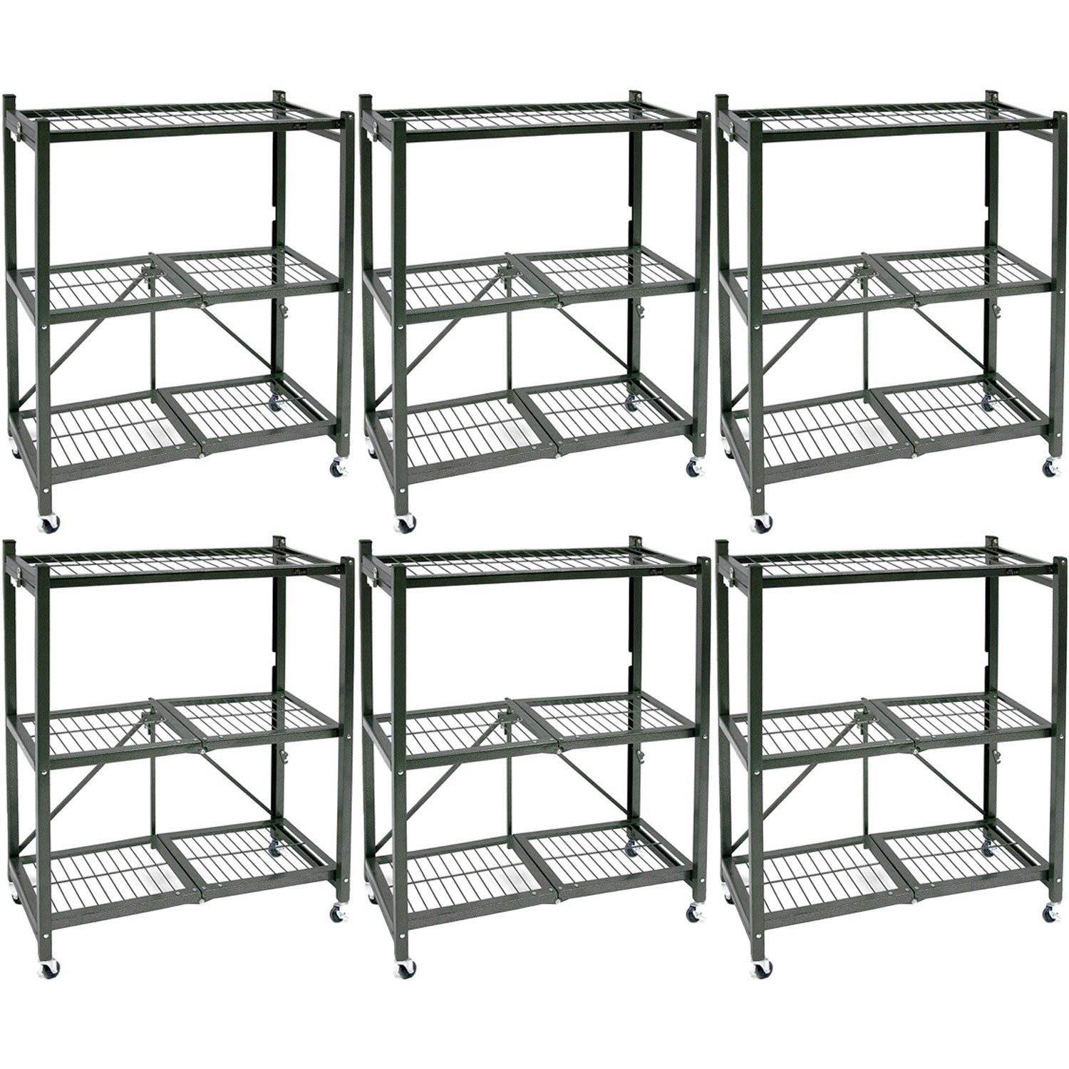 - 6-pack of 3-tiered foldable shelf and storage racks that requires no assembly and folds flat when not in use