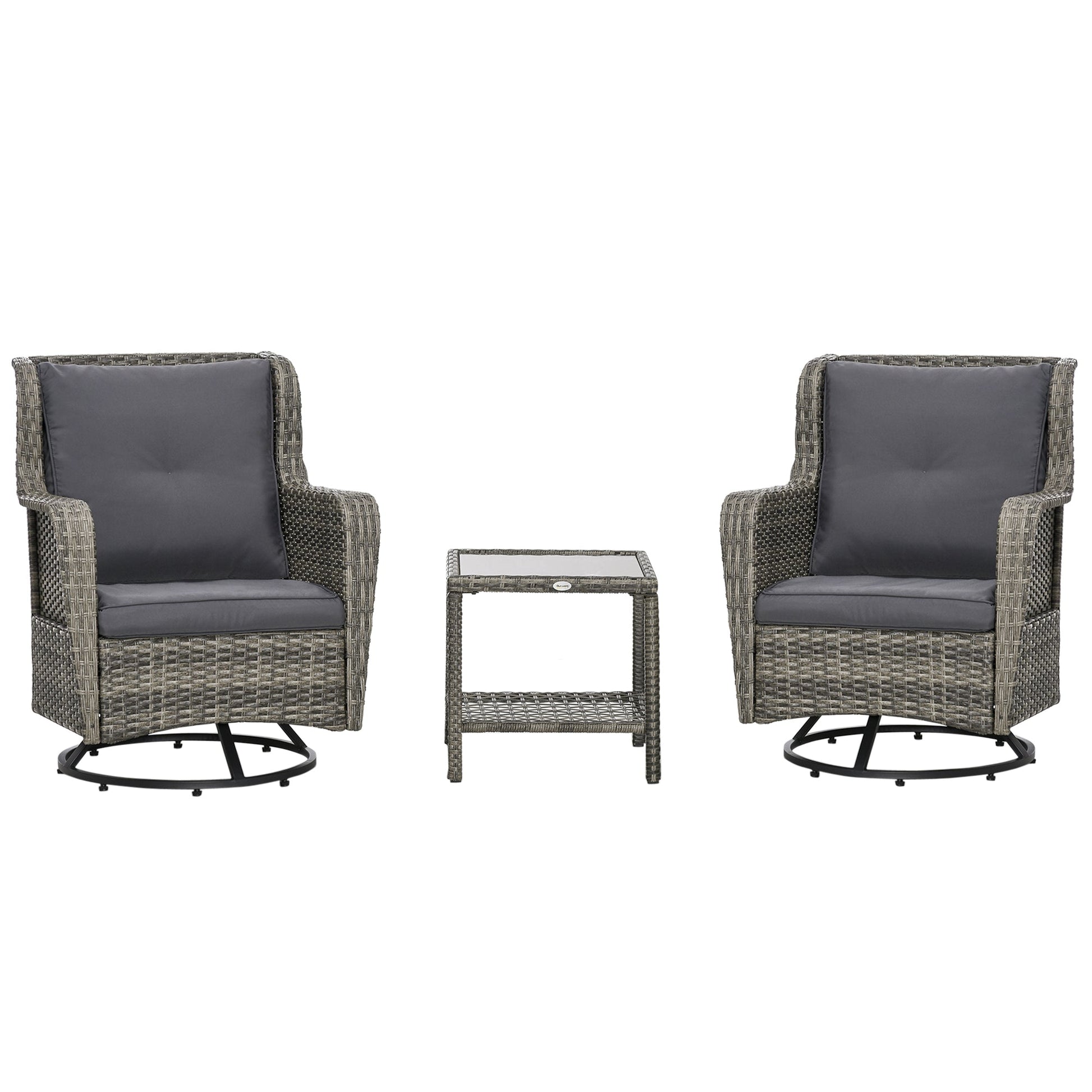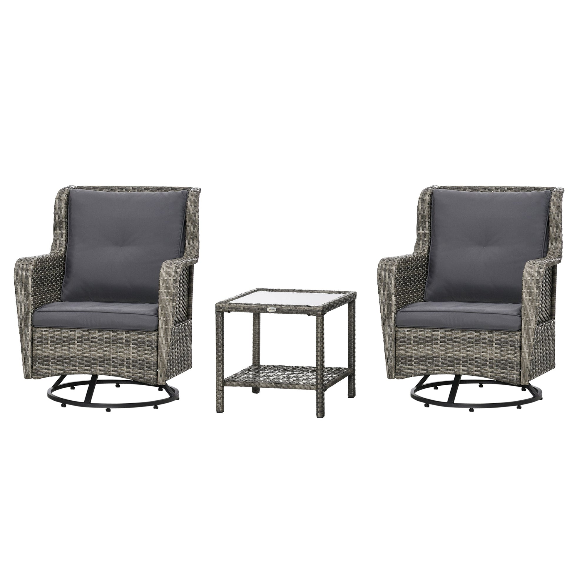 - 3-Piece Rattan Patio Furniture Set: Catch up with a good friend in the great outdoors when you elevate your sitting space to indoor comfort. Our outdoor furniture set features two swivel rockers and a two-tier patio coffee table.