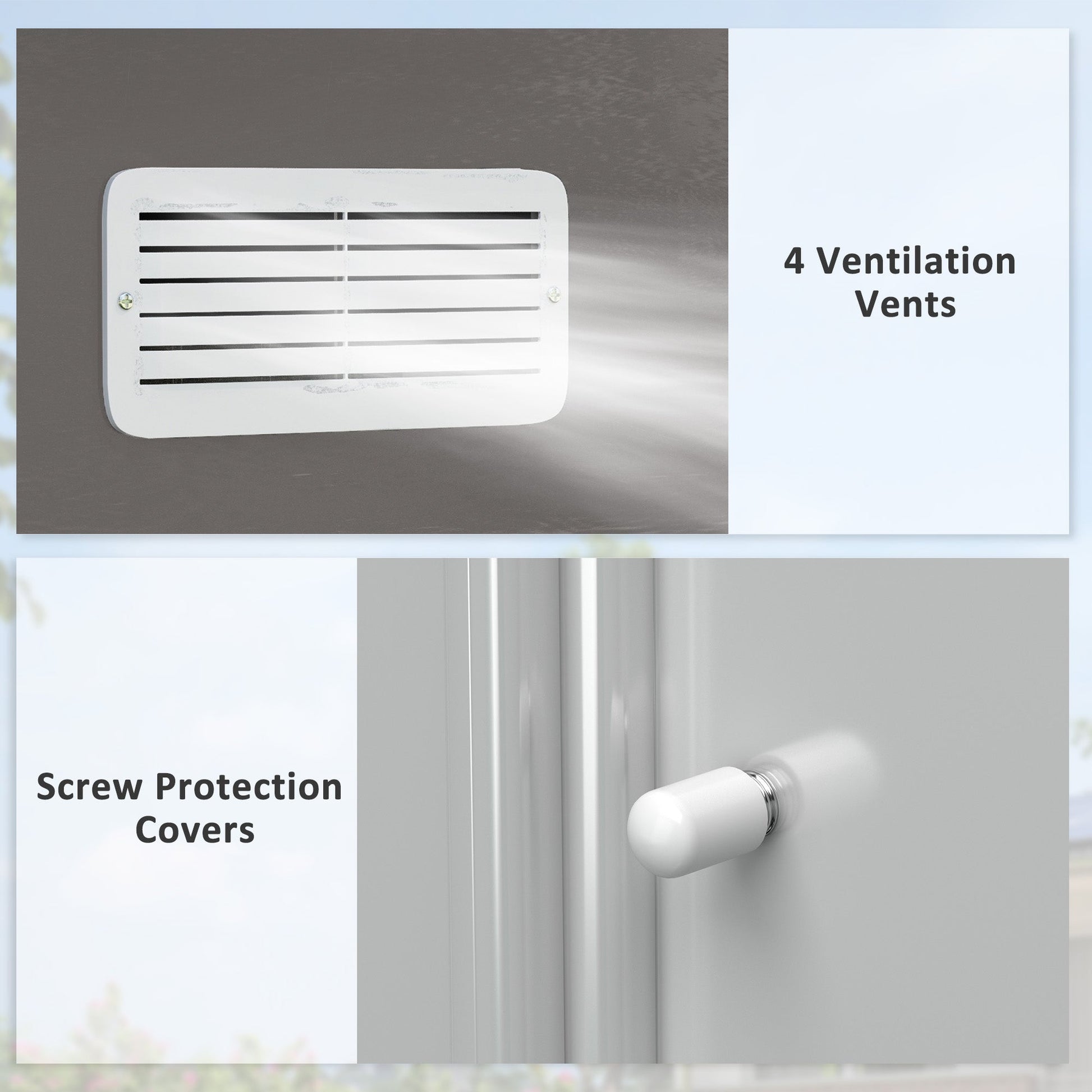 - Good Ventilation: Our metal outdoor storage sheds feature four ventilation slots on the front and back, increasing light and airflow. This prevents odor and keeps your equipment and tools dry.