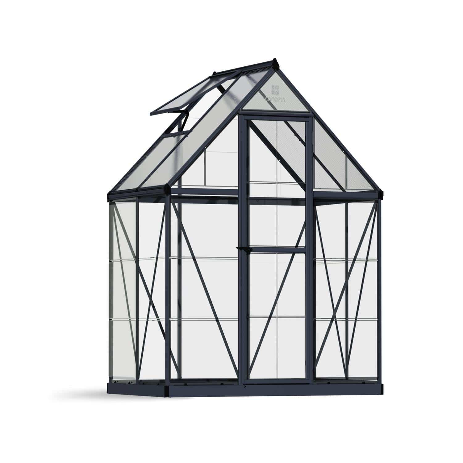 A roof vent and door with magnetic catch keep air flowing, helping you control the temperature and humidity in your greenhouse. When it comes to set-up, this house is designed as a do-it-yourself project without the need for special tools, so you’ll be ready to start growing in no time. A smart panel slide and lock system connects the frame precisely and quickly into place and polycarbonate panels slide easily into profile channels. The aluminum frame is durable, maintenance free, and rust resistant allowing you to focus on growing instead of maintaining your greenhouse. Palram - Canopia also offers a complete line of accessories designed to make your Nature Hybrid greenhouse more productive, space saving, and protective against the elements.
