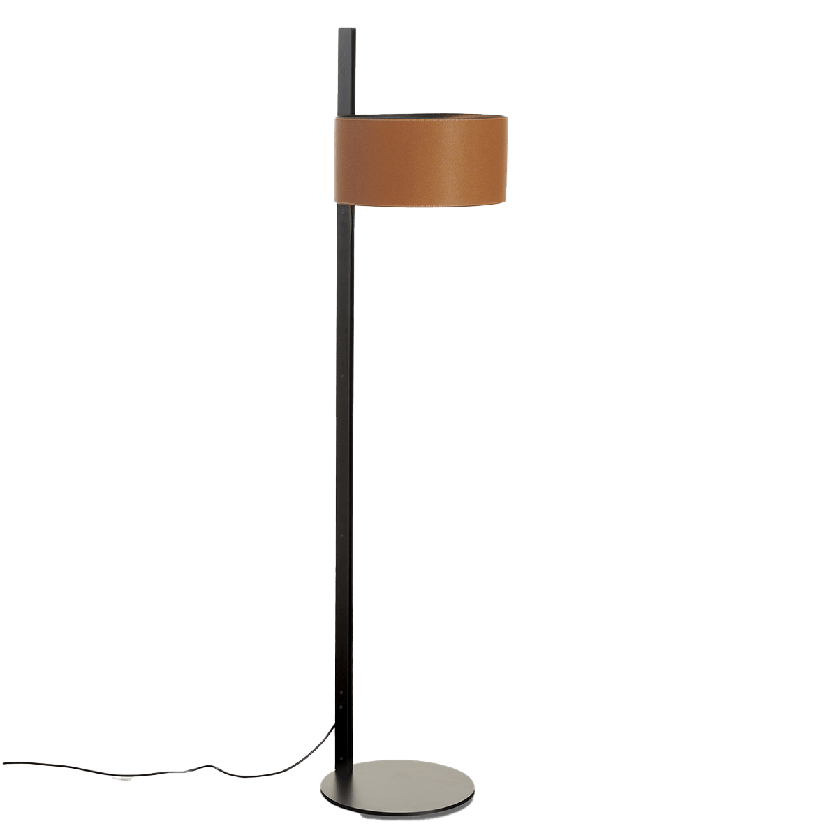 The Oluce Parallel Floor Lamp, designed by Victor Vasilev, is a striking piece that blends modern design with innovative craftsmanship. Its cylindrical metal lampshade is supported by a vertical stem, which moves laterally. This stem features two matte-black metallic plates that slide in parallel directions, adding a sleek, dynamic quality to the design. What truly sets this lamp apart is its lampshade, which is covered in hammered leather, available in leather brown and sand. This marks the first time that Oluce has introduced leather in their lighting collections.