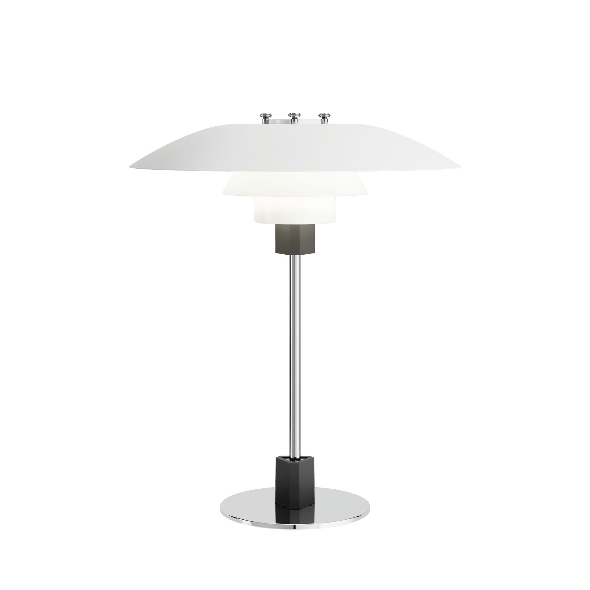 The Louis Poulsen PH 4/3 Table Lamp features a three-shade system that directs light downward. The metal shades are painted white to ensure a soft, diffused light. This design creates a comfortable, inviting ambiance. The PH 4/3 Table Lamp is perfect for any space that requires both style and functionality.