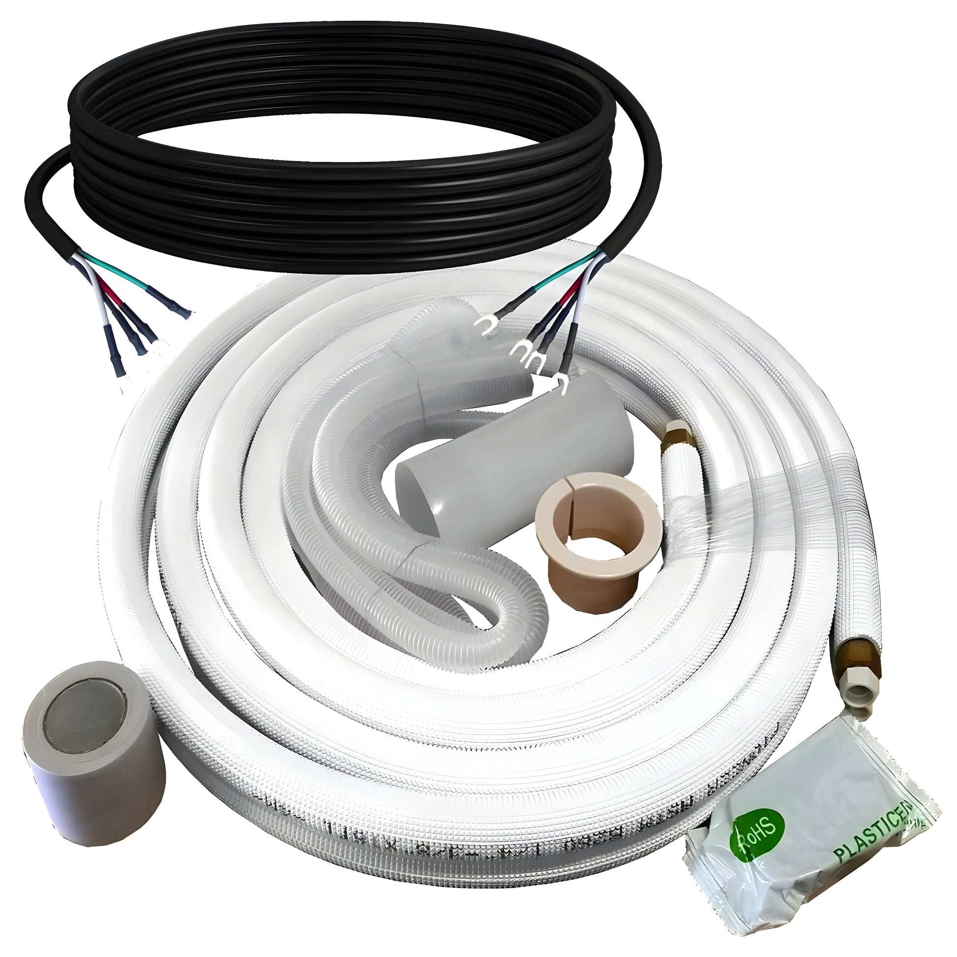The installation kit is: 25 ft. copper refrigeration lines, communication wire between indoor and outdoor unit, 10 ft drain hose, wall cap, sleeve, and putty.
