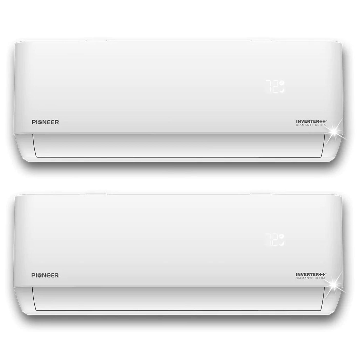 Meet the Pioneer Diamante Mini Split System to cool and heat two different rooms. You'll be sent: 27,000 BTU Multi-Zone Condenser, one 9,000 BTU Wall Mounted Air Handler, one 18,000 BTU Wall Mounted Air Handler, two Remotes, and two 50 ft. Installation Kits.