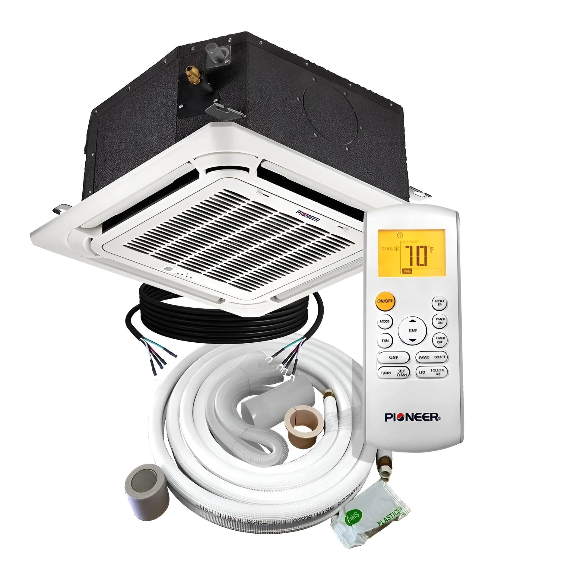 Q: What are the key features of the Pioneer Multi Zone 9,000 BTU Ceiling Cassette Air Handler?