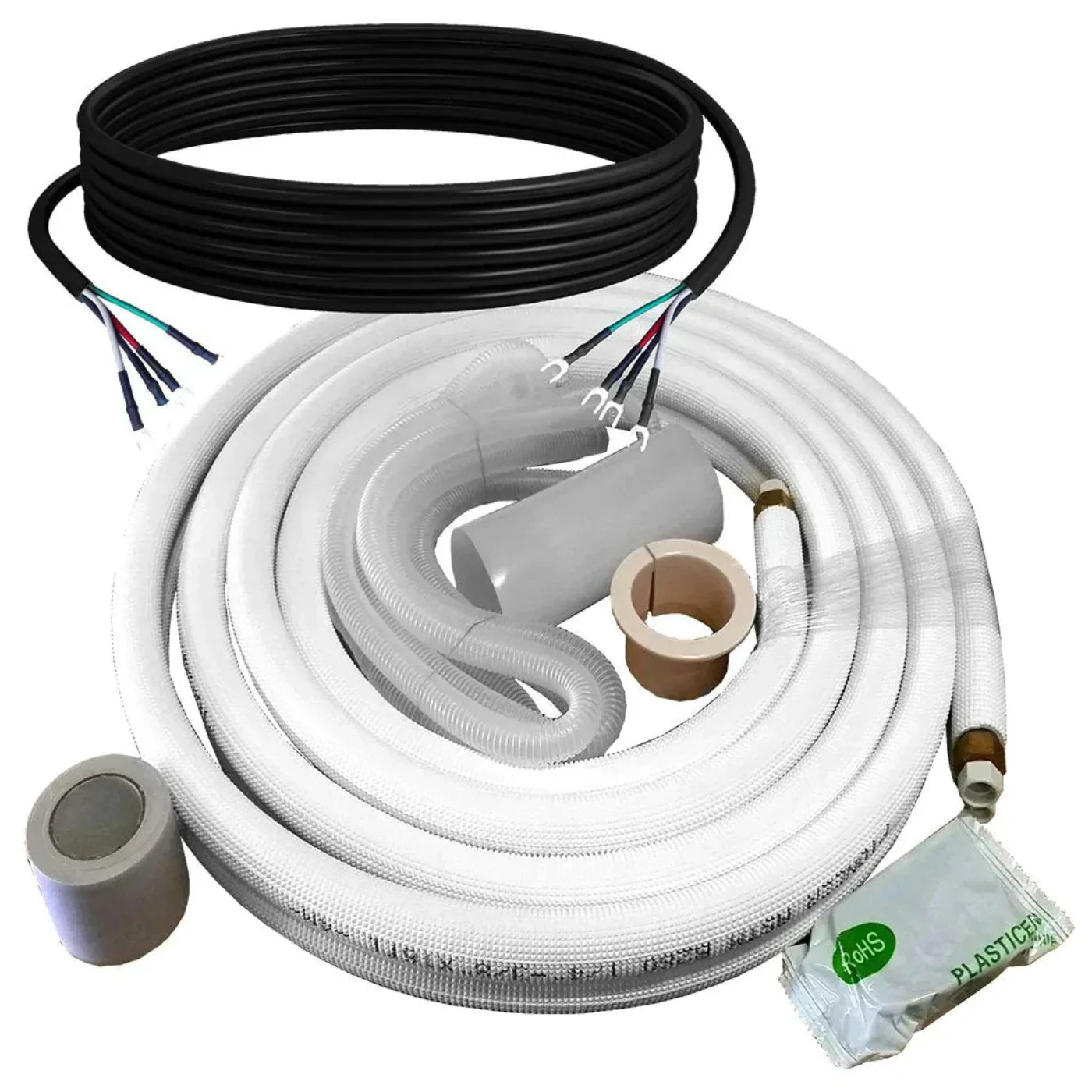 The copper tubing is included in the outdoor unit cardboard box and the communication wiring kit is included in the indoor unit cardboard box.