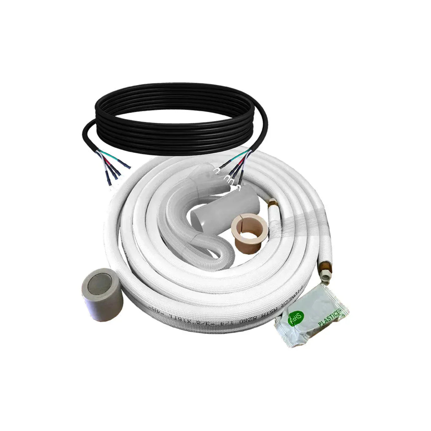 The installation kit is: 25 ft. copper refrigeration lines, communication wire between indoor and outdoor unit, 10 ft drain hose, wall cap, sleeve, and putty.