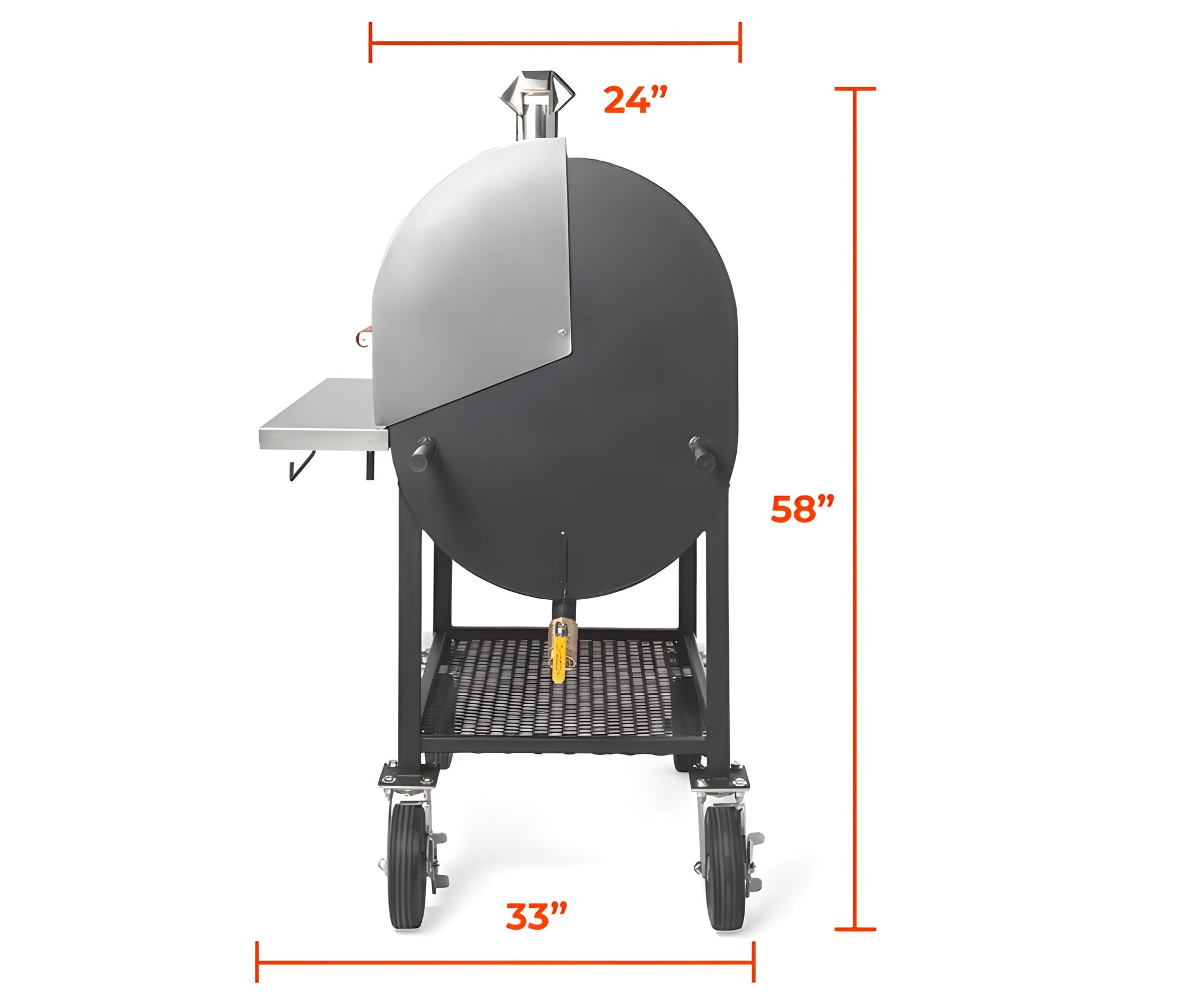 The carbon steel cooking chamber is made of 7 and 10 gauge carbon steel. This grill comes standard with our signature 304 stainless steel lid and work shelf.