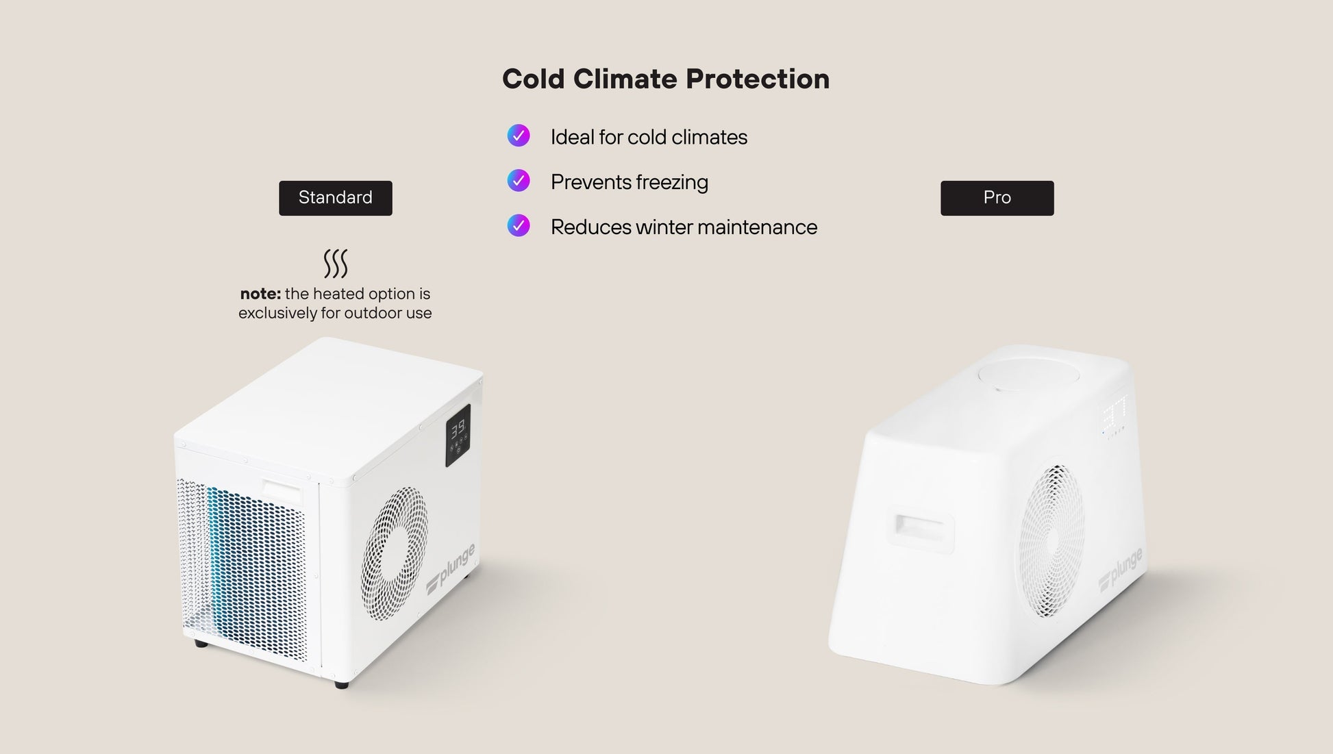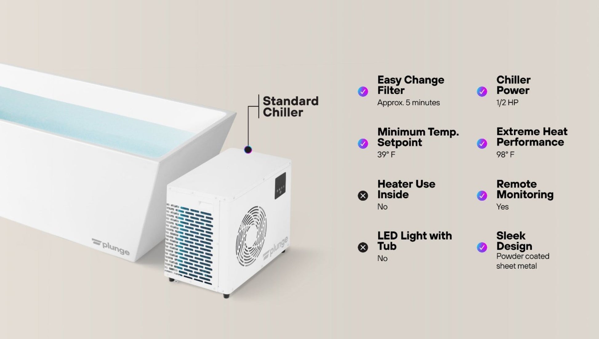 Experience the gold standard in cold therapy with The Plunge. Featuring powerful cooling, advanced filtration, and seamless sanitation, The Plunge is meticulously crafted to deliver exceptional performance and enduring reliability. Its spacious acrylic design comfortably fits users up to 6'8", while enhanced insulation ensures consistent temperatures with maximum efficiency. Customize your experience by choosing between the Standard or Pro Chiller — giving you the flexibility to prioritize ultra-quiet operation, faster cooling, or the perfect balance for your needs. With effortless setup and a sleek, modern aesthetic, The Plunge delivers professional-grade recovery at home with elegance and ease, backed by a time-tested design trusted by the pioneers of cold therapy.