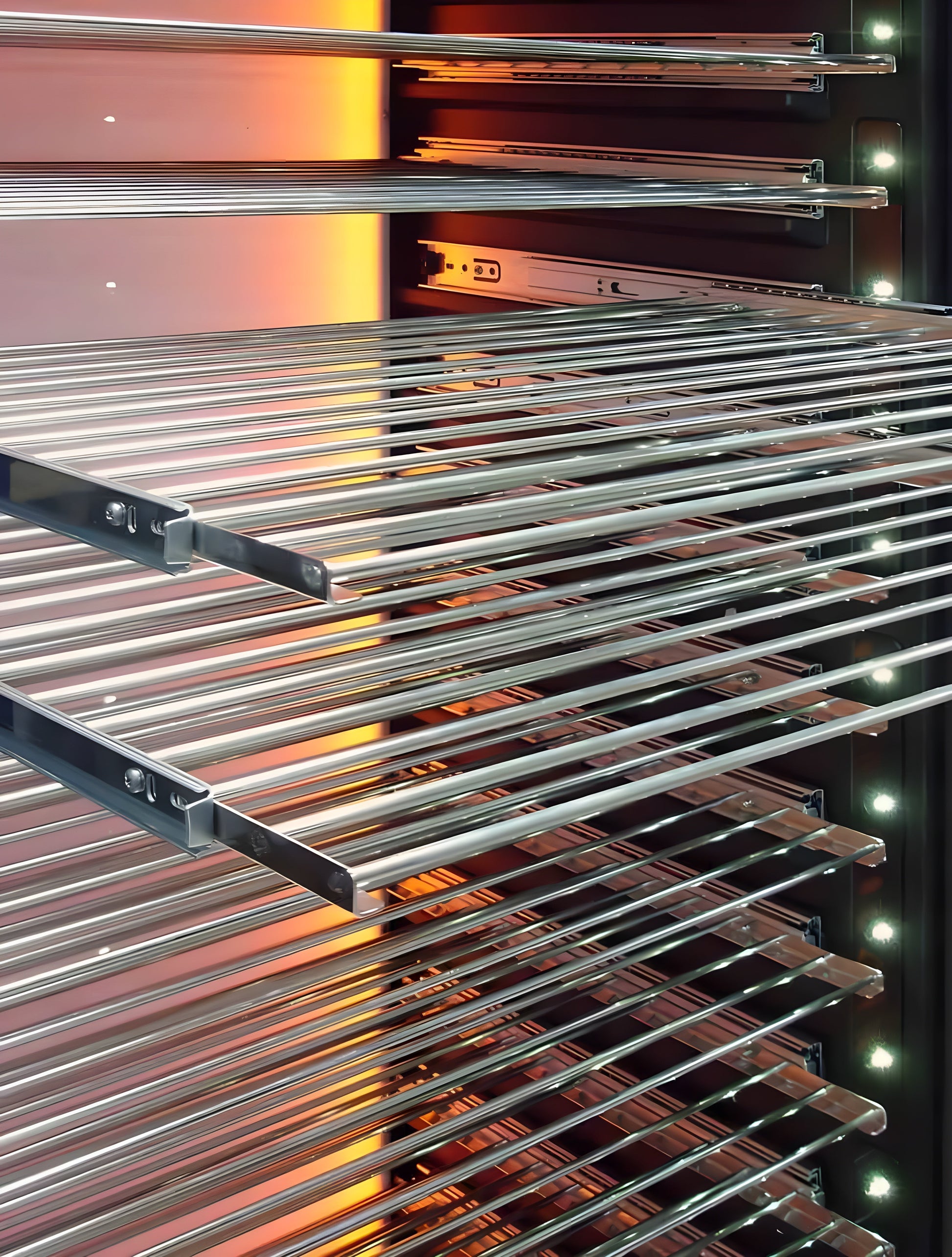 A: The UV-resistant glass doors prevent light exposure, while the powerful compressor cooling system maintains a stable environment for long-term storage.