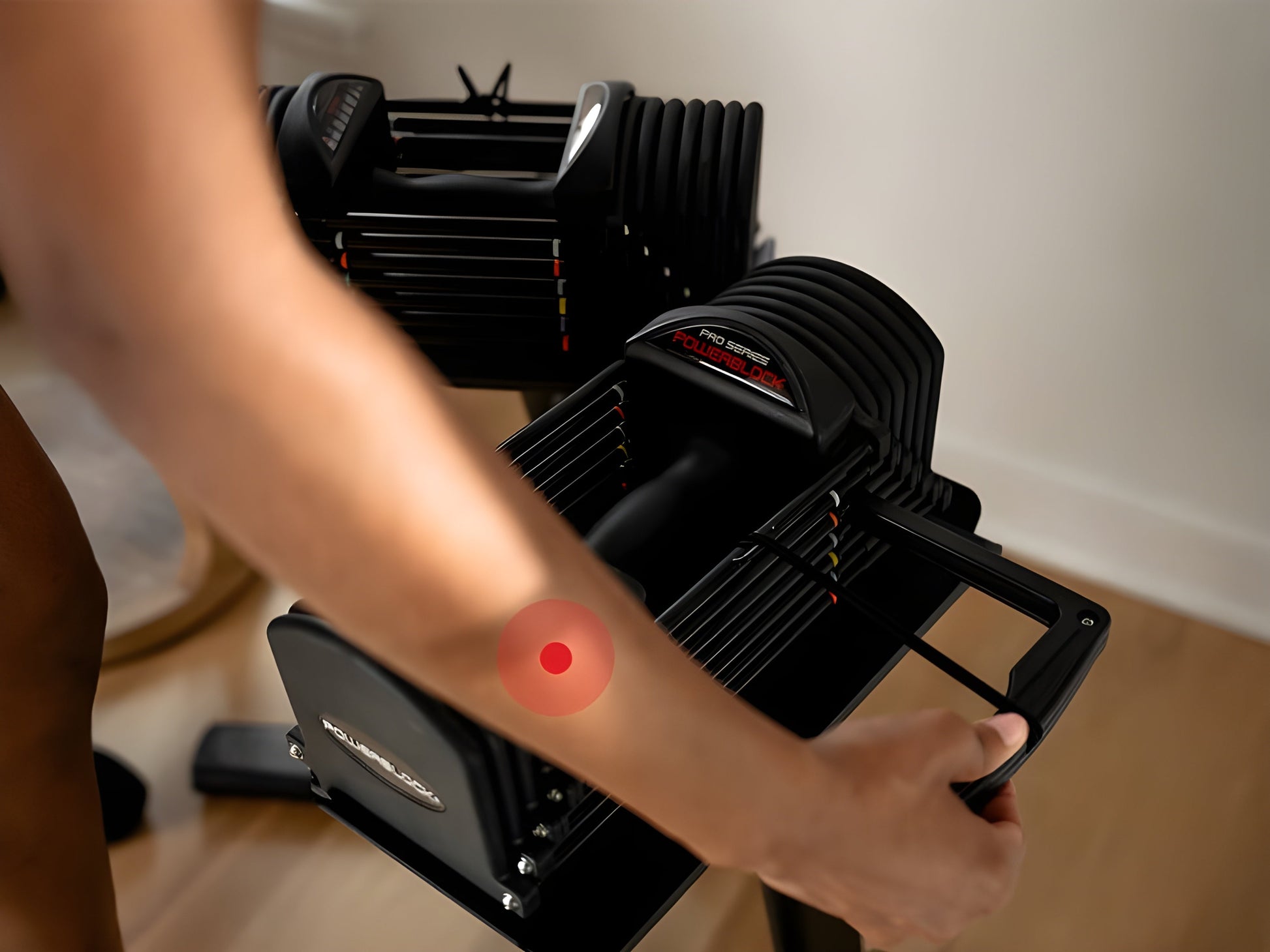 Compact & Adjustable – The PowerBlock Pro 32 replaces 8 dumbbells, adjusting from 4 to 32 lbs per hand.