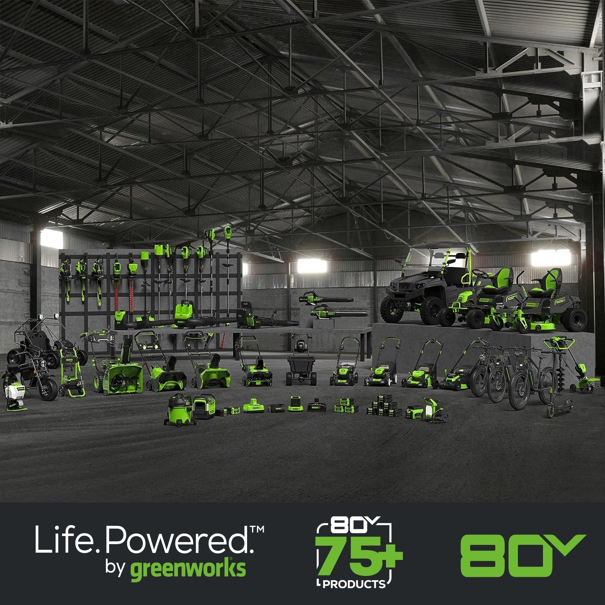 - Power 75+ Tools with any Greenworks 80V Battery