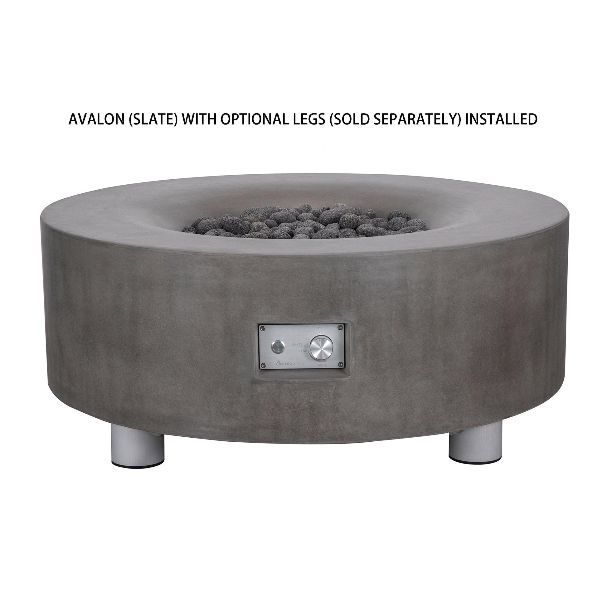 Avalon combines the shape of Genesis and Infinity together in a larger size with a matte finish all around. Hand-made from reinforced high-performance concrete in a choice of 2 colorfast colors. Standing in at 18" high with the legs installed and 14 1/2" high without. It is 42" in diameter and weighs 190 pounds. Equipped with our new 60,000 BTU "Professional" burner system which includes a commercial grade burner, 12v (8X AA battery operated) push-button ignition, and a hi-fidelity style control panel.