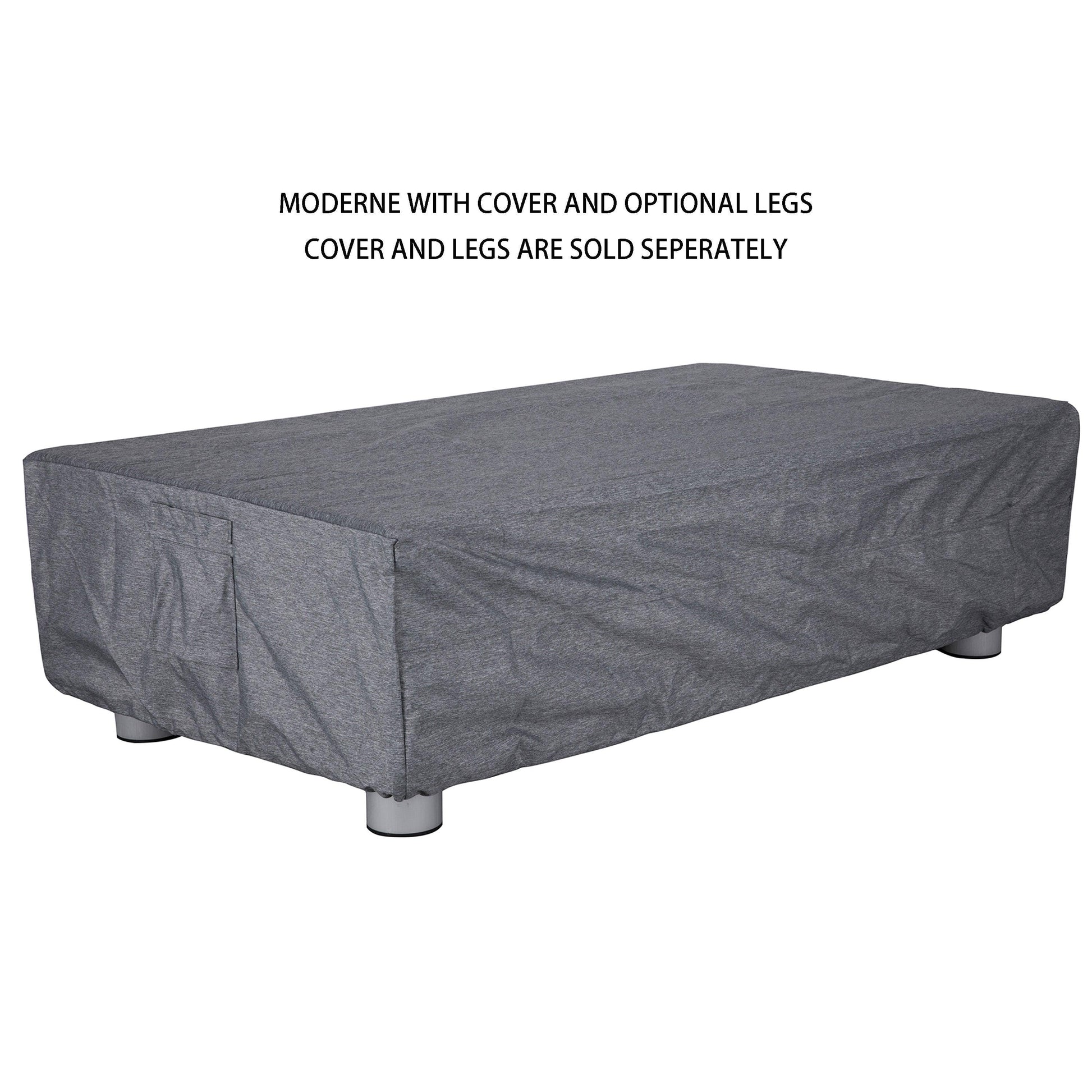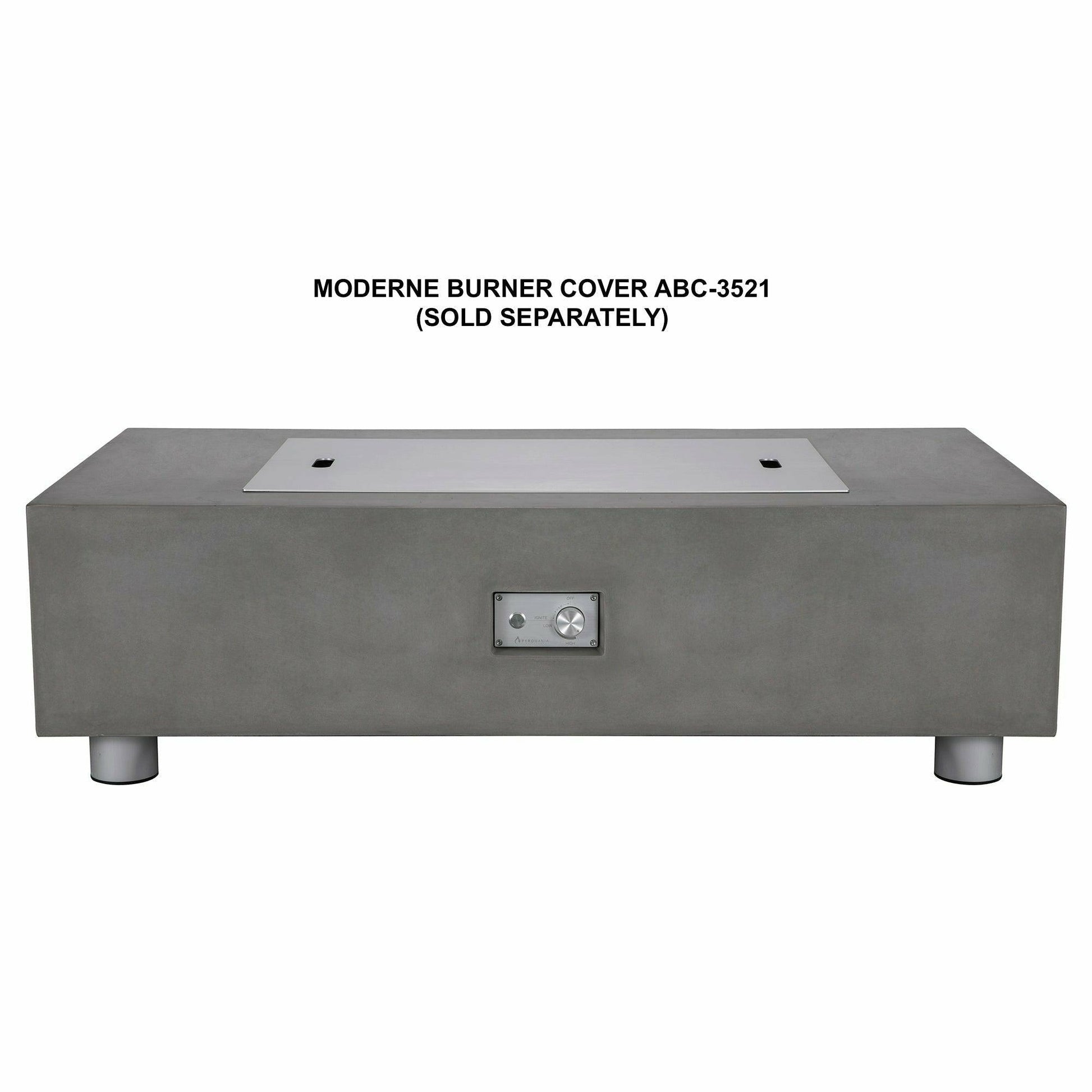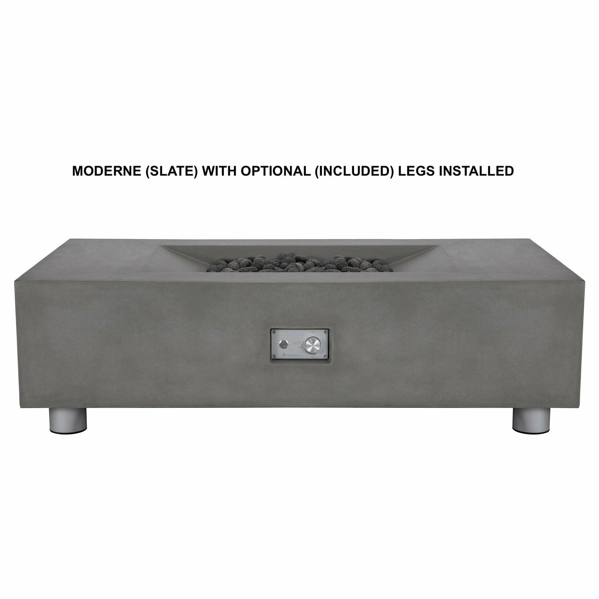 The Moderne is our biggest table. As the name suggests, the design is quite contemporary. Hand-made from reinforced high-performance concrete with a honed finish and in a choice of 2 colorfast shades (Charcoal Grey and Slate Grey). Standing in at 18" high with the legs installed and 14 1/2" high without. It is 32" wide, and 58" long and weighs 220 pounds. Equipped with our new 60,000 BTU "Professional" burner system which includes a commercial grade burner, 12v (8X AA battery operated) push-button ignition, and a hi-fidelity style control panel.