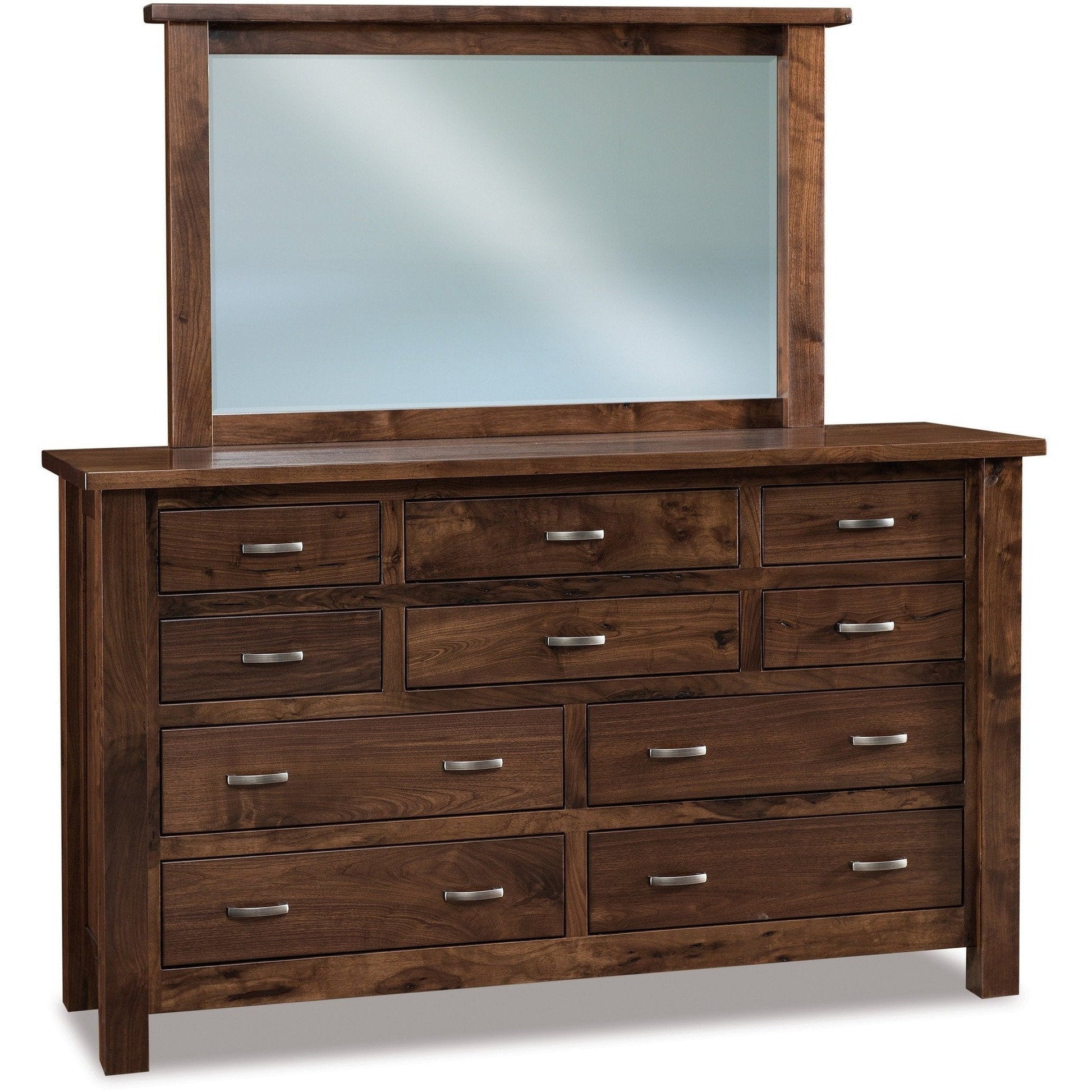 A: A handcrafted solid wood dresser offering ten spacious drawers for maximum bedroom storage, with an optional coordinating mirror available.