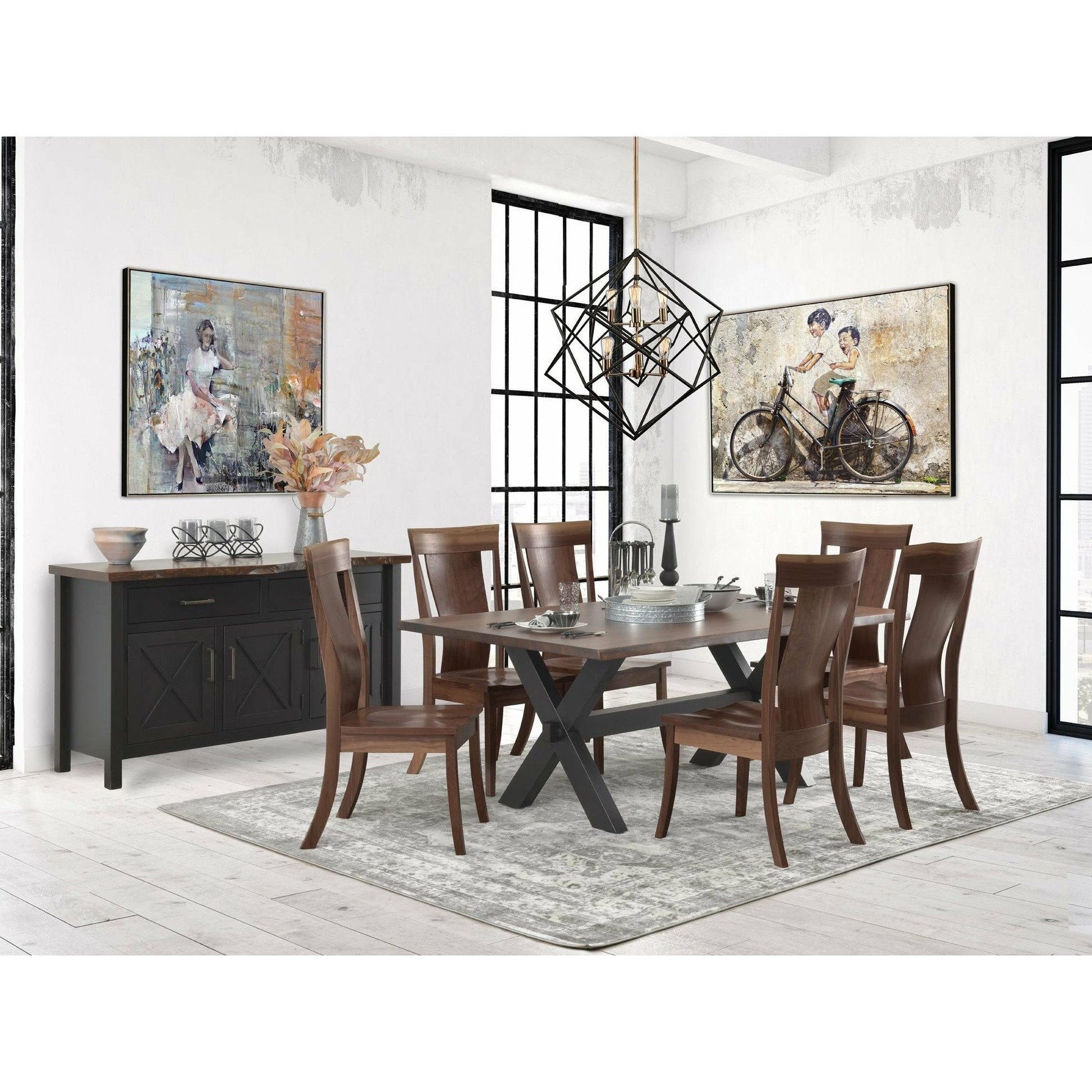 The Manhattan Collection features a gorgeous live edge table top. Pictured with all rustic walnut chairs and ebony base, this set will impress your guests.