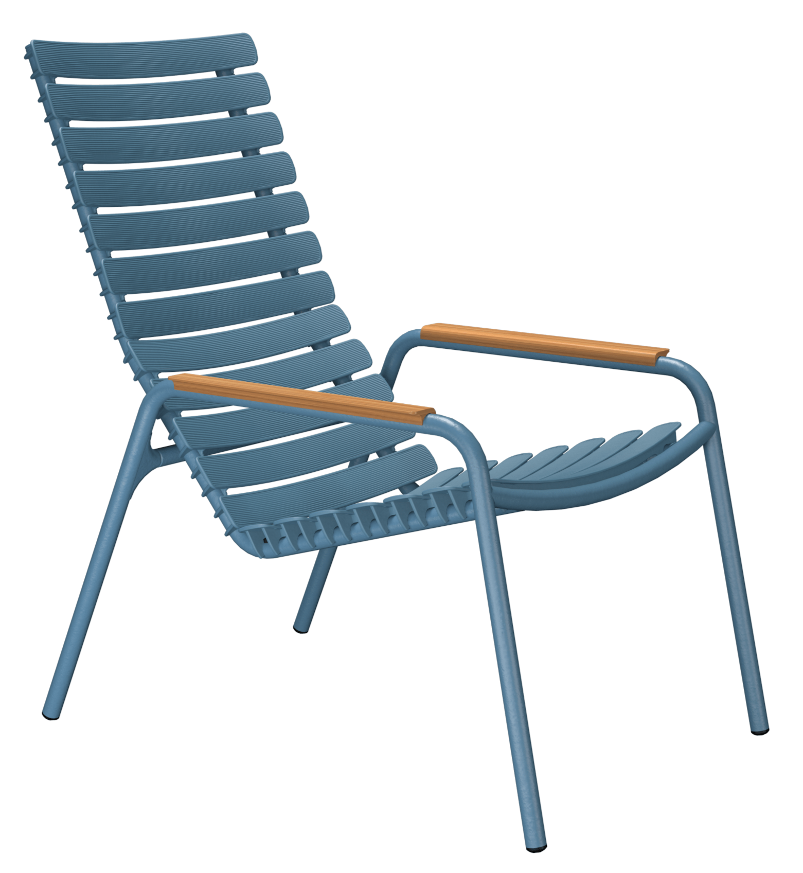 Lightweight yet durable, the ReCLIPS Outdoor Lounge Chair features a powder-coated aluminum frame for lasting performance. Its stackable design saves space, while earthy tones blend easily with teak outdoor furniture or a round coffee table. You can choose between bamboo or aluminum armrests to match your look. When paired with the matching footrest, the ReCLIPS Outdoor Lounge Chair creates an effortless lounge setup for any outdoor patio.