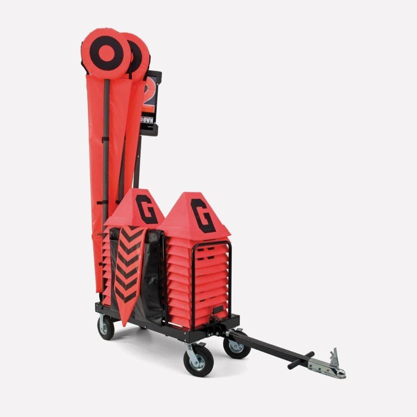 The Rogers Game Day Trailer with Stadium Pro Set and Standard Poles makes field setup and equipment transport fast and effortless. Its durable foam-filled wheels never go flat, and the versatile towing options—by hand or behind a motorized vehicle—ensure efficient sideline management.