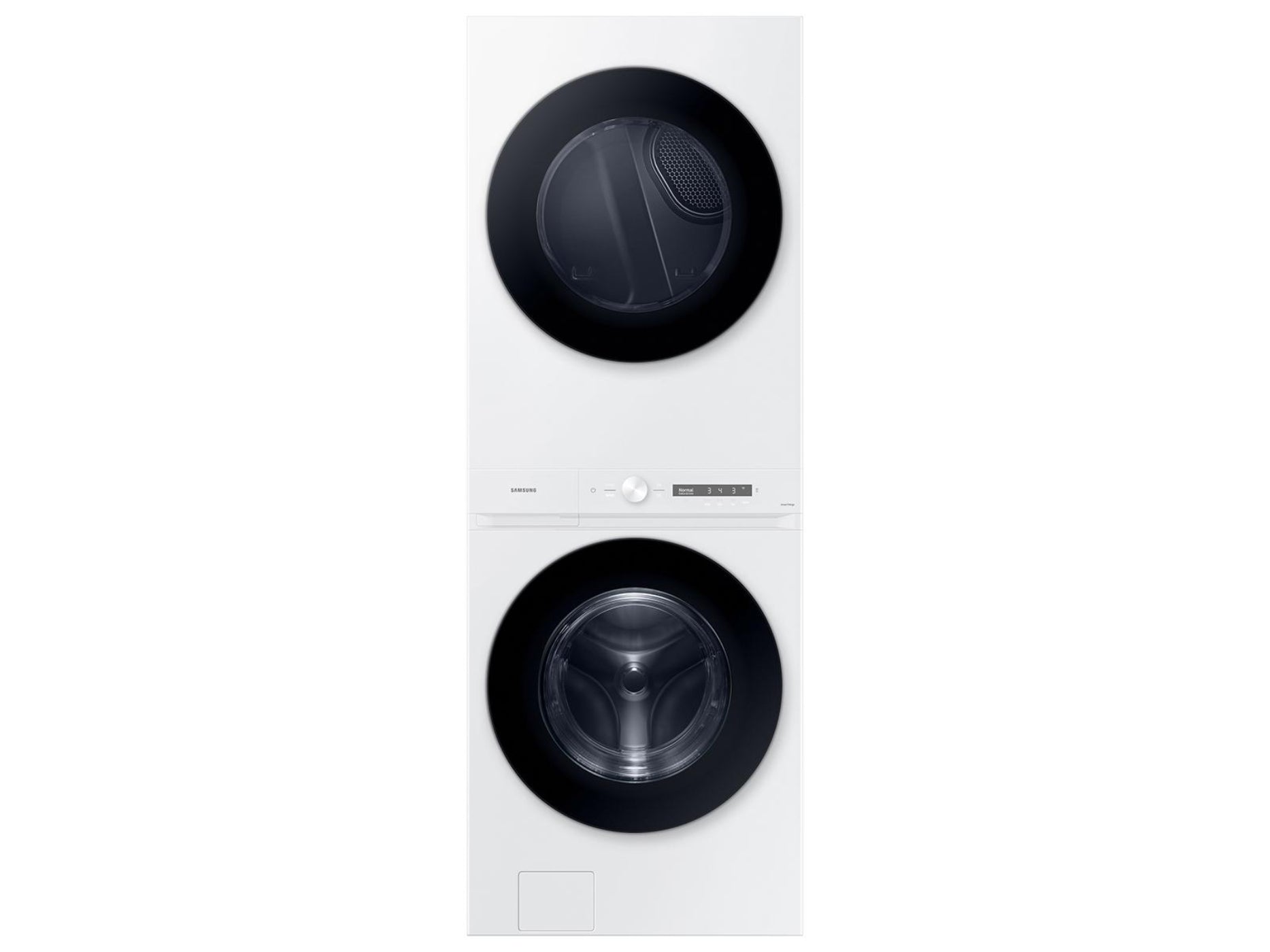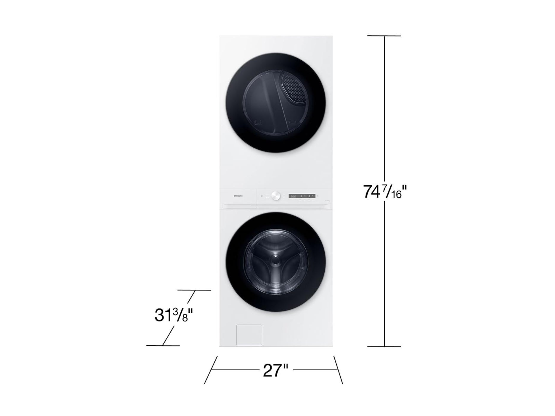 A: A Bespoke 4.6 cu. ft. AI-capable washer paired with a 7.6 cu. ft. gas dryer in a single large-capacity unit, offering smart laundry solutions in a sleek white finish.
