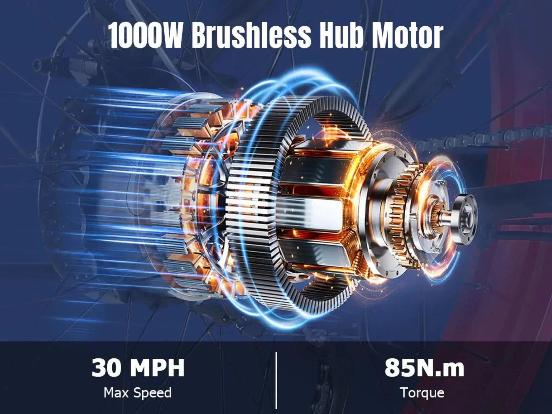 Powerful Motor: Equipped with a 1000W brushless hub motor, delivering up to 1200W peak power and 85Nm of torque, enabling speeds up to 30 MPH and effortless navigation through challenging terrains.