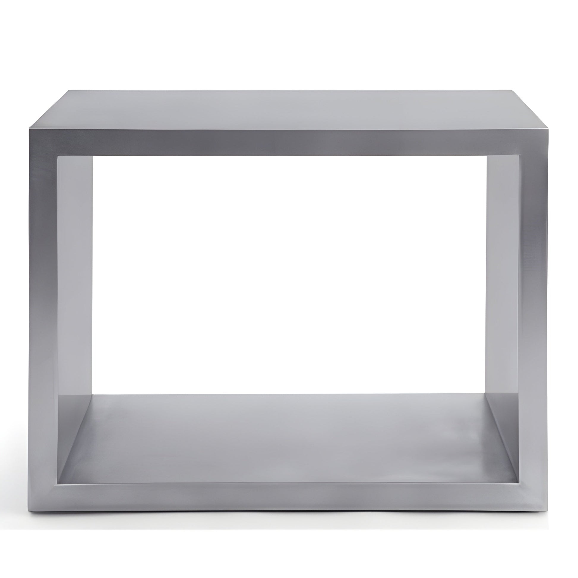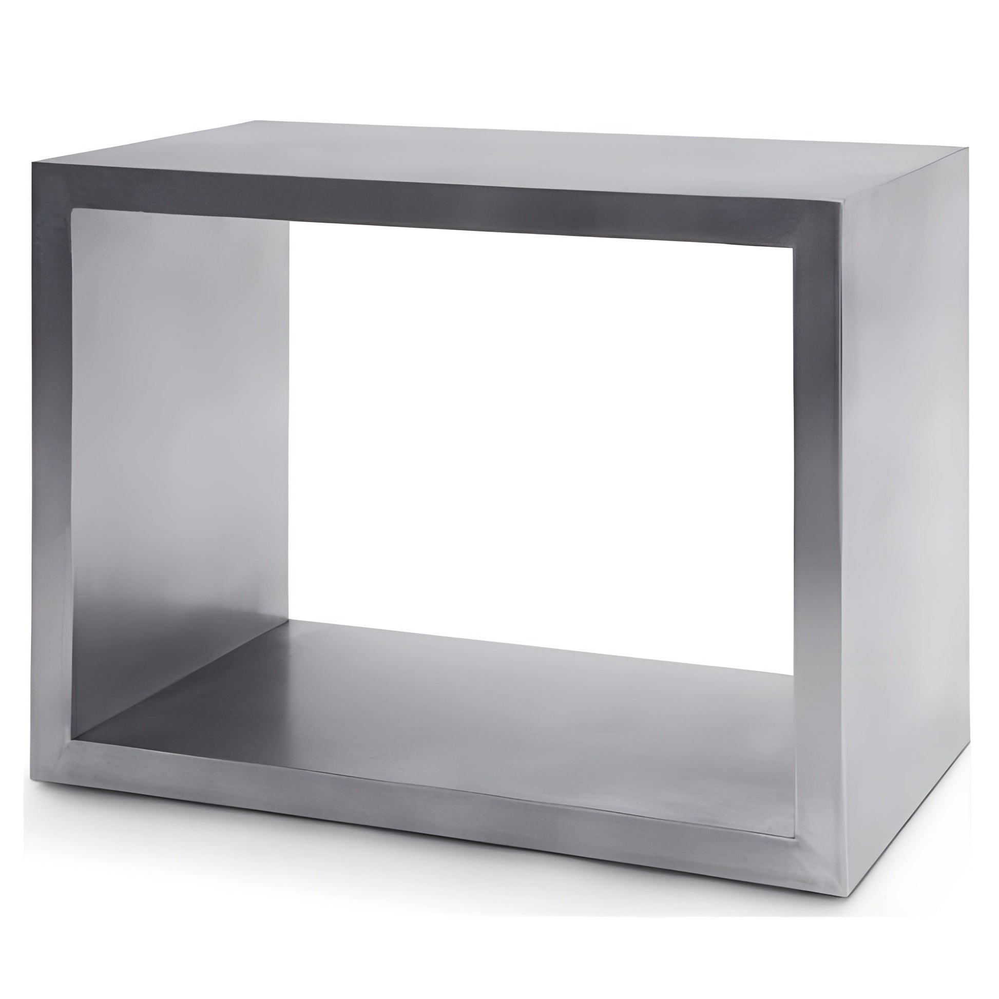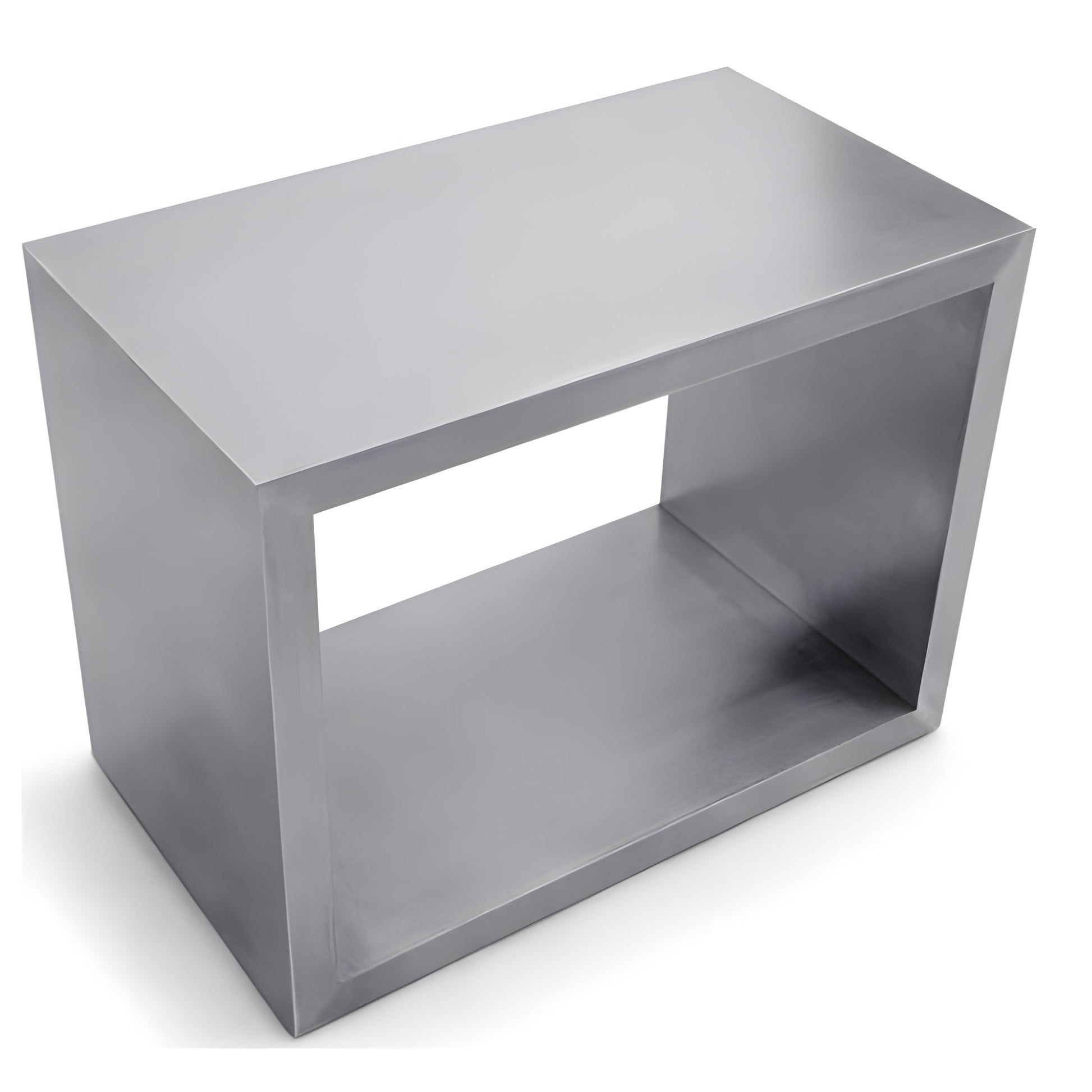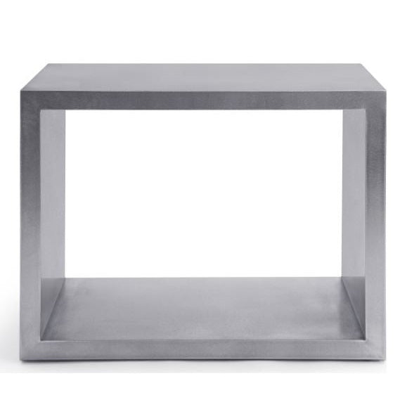 The "Piero" side table is a beautifully scaled simple rectangular form. Both horizontal surfaces are usable for storage, display, or to hold a glass or cup. The material is stainless steel with a non-directional finish. This will not stain, rust, chip, or tarnish for the life of the table! This is a modernist masterpiece of refined simple form with maximized function.