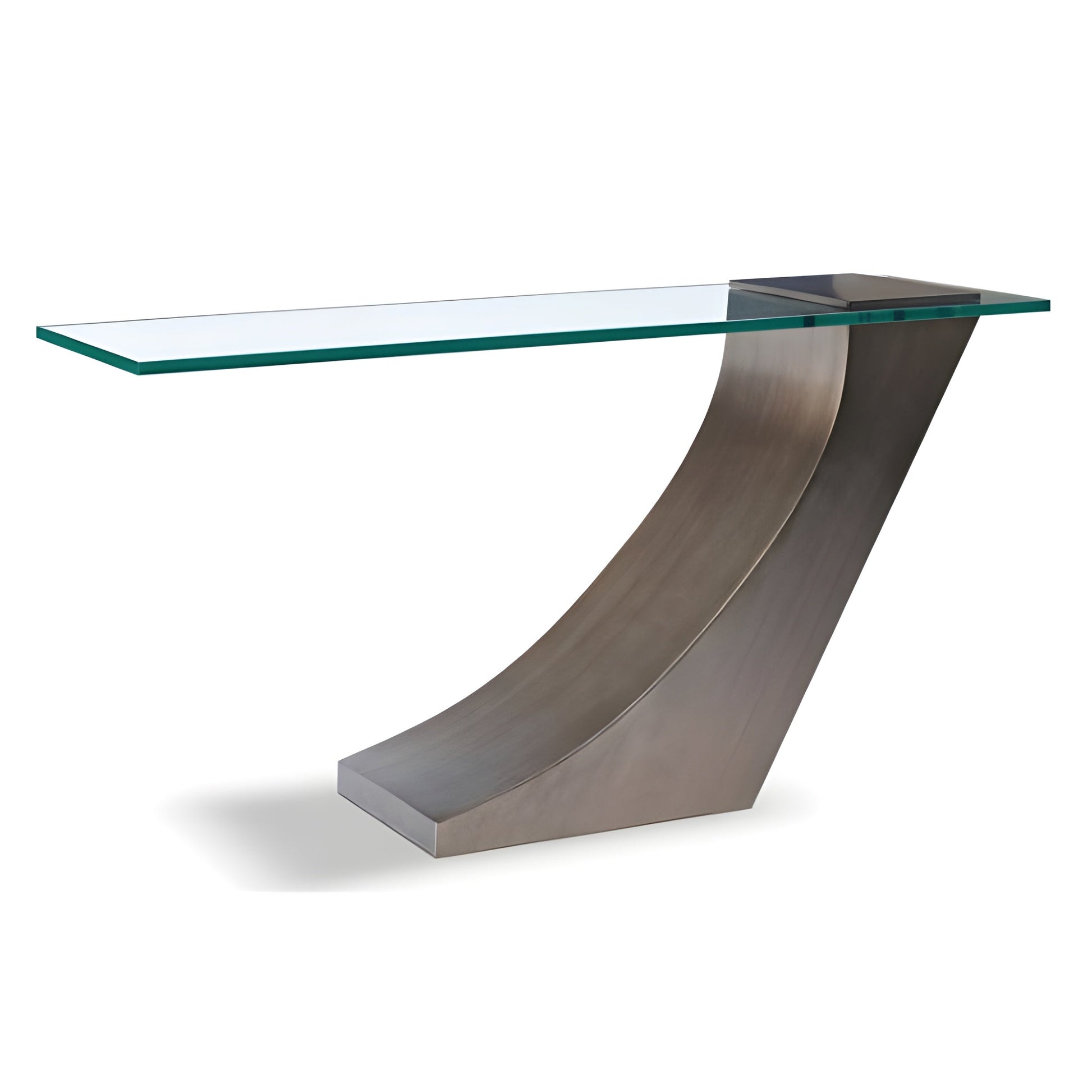 Sculptural, elegant, and timeless, the "Clasp" console table by Greg Sheres is a striking addition to any interior. Crafted from high-quality stainless steel with a hand-applied antique brushed bronze finish, this console table makes a bold statement while maintaining a minimalist spirit. The graceful curve and gravity-defying cantilevered glass are the main components of this functional piece of art. This classic original design by American designer Greg Sheres has been featured and sold worldwide, showcasing its universal appeal and exceptional craftsmanship.