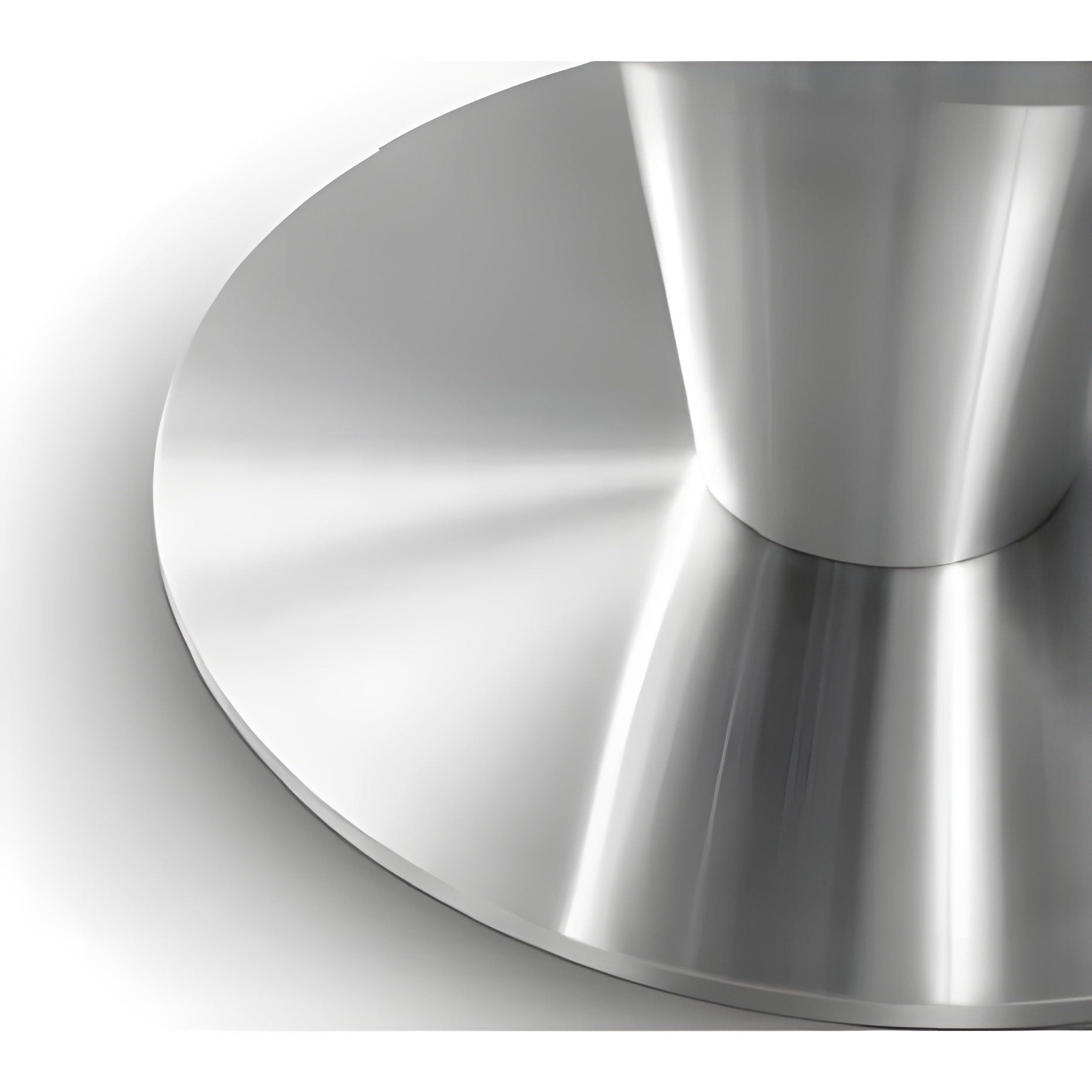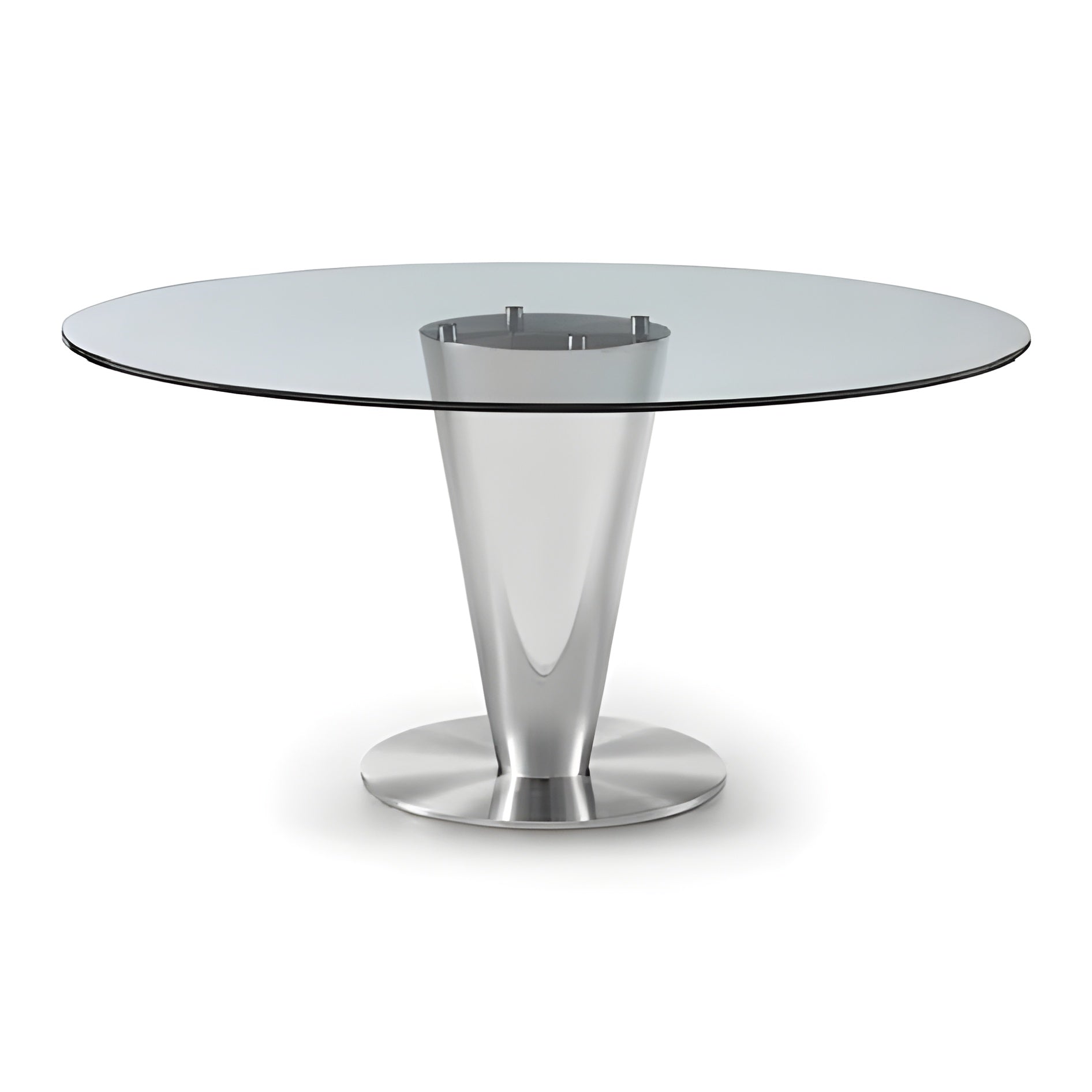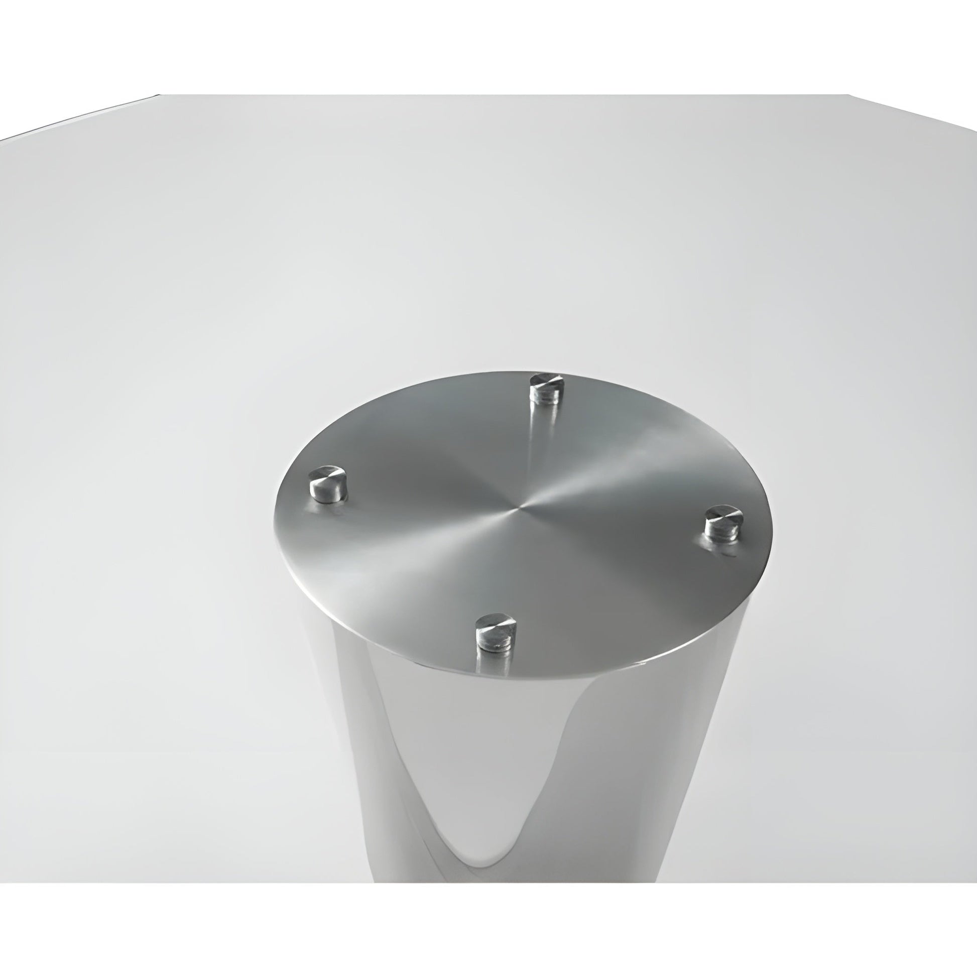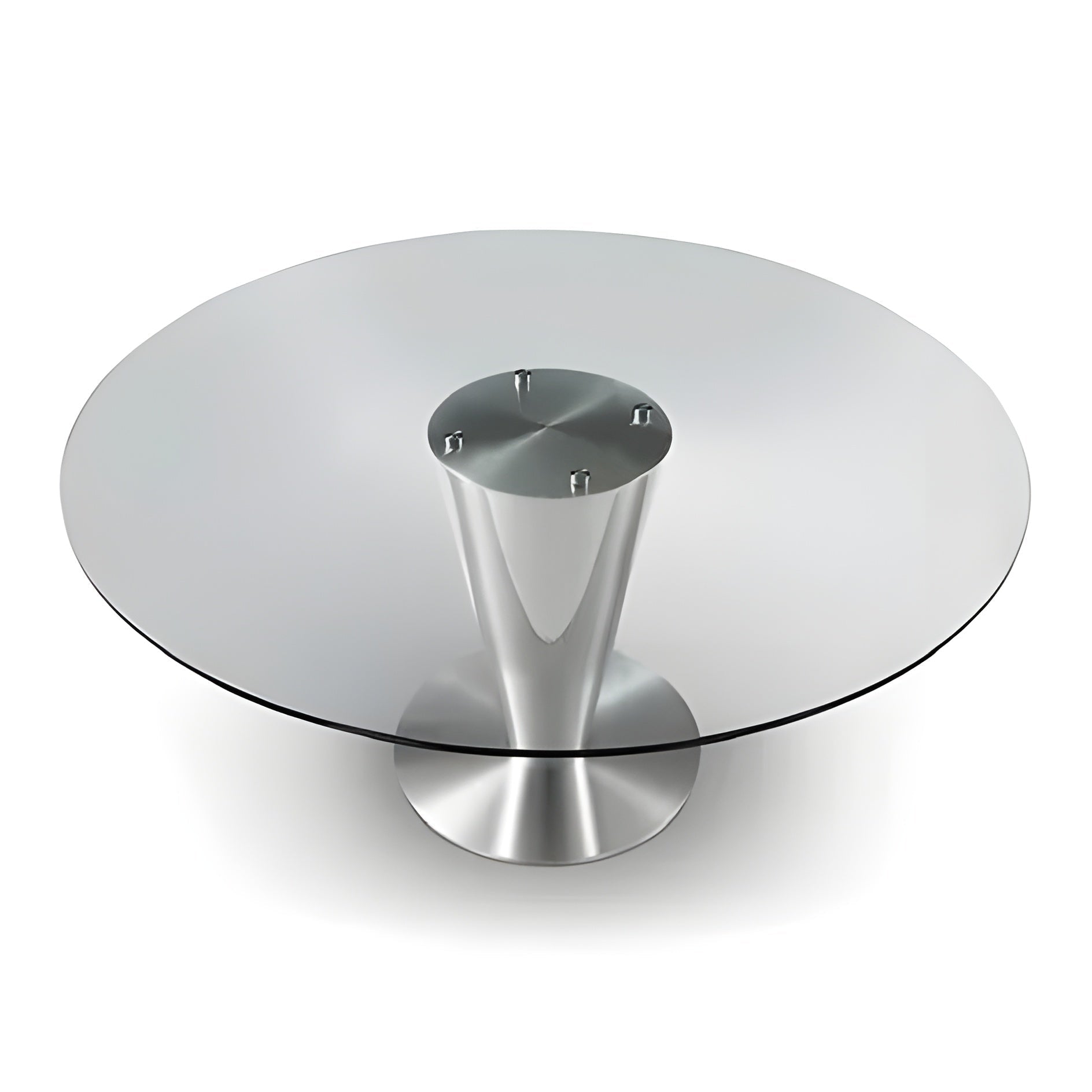 Sleek and elegant with a strong Art-Deco vibe this round stainless steel table will look great in your dining room or in your entry hall. Made completely out of stainless steel with a 3/4” thick glass top. The tall tapering column is mirror polished and the flat disc at the bottom has a satin finish to accent it.