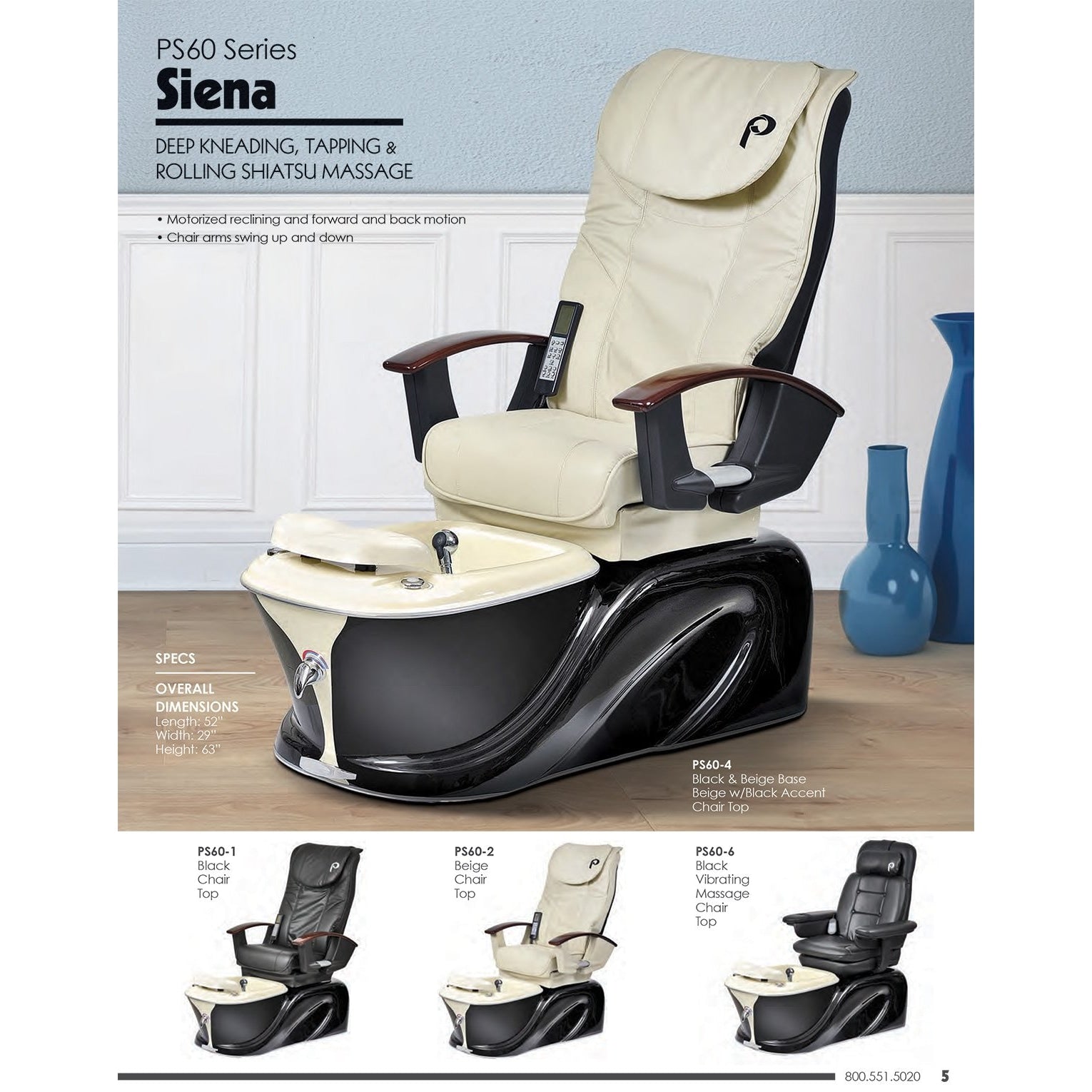 The Pibbs PS 60 Siena Pipe Free Turbo Jet Pedicure Chair w/ Shiatsu Massage is the newest addition to the long standing Pibbs pedicure line. This European styled pedicure chair features a black acrylic base and fully electric sliding and reclining Shiatsu Massage chair top that provides your client deep kneading, tapping and rolling massage functions. The PS 60 Siena also features an adjustable footrest, retractable spray hose, color changing LED lights and a pipe free turbo jet system with adjustable jet pressure. Designed with client comfort in mind, the PS 60 offers arms that raise and lower for easy access for clients of any age and size.Â