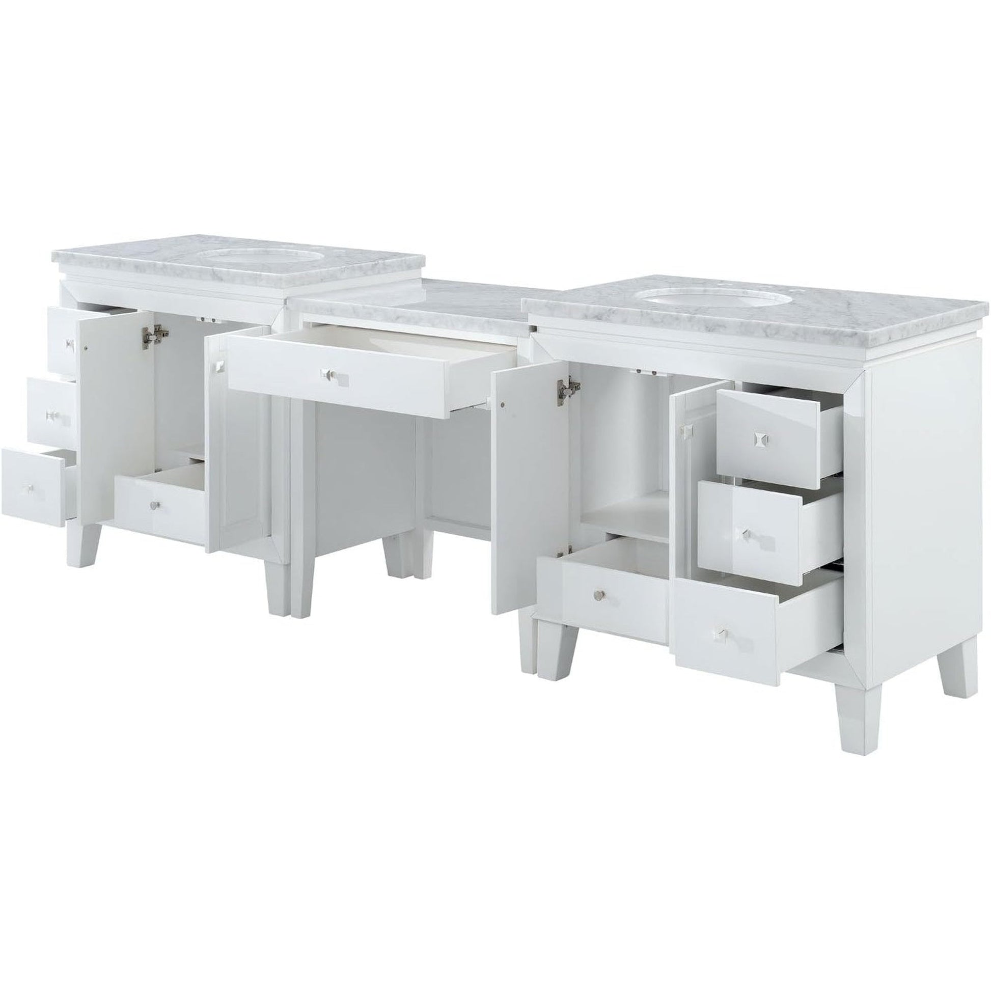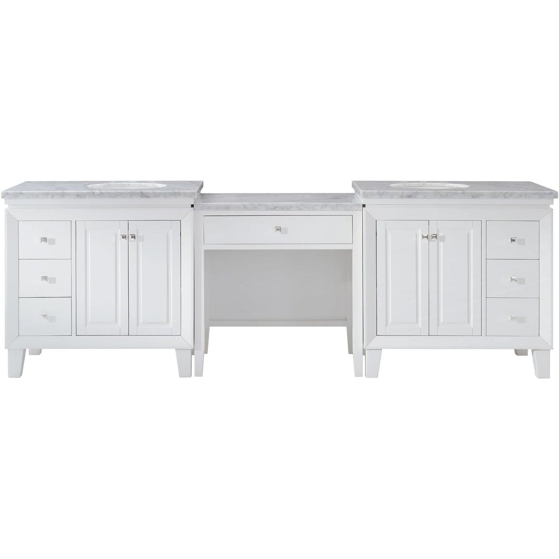 A: The vanity has a clean, bright white finish that complements the stunning Carrara marble countertop and the white ceramic undermount sinks.