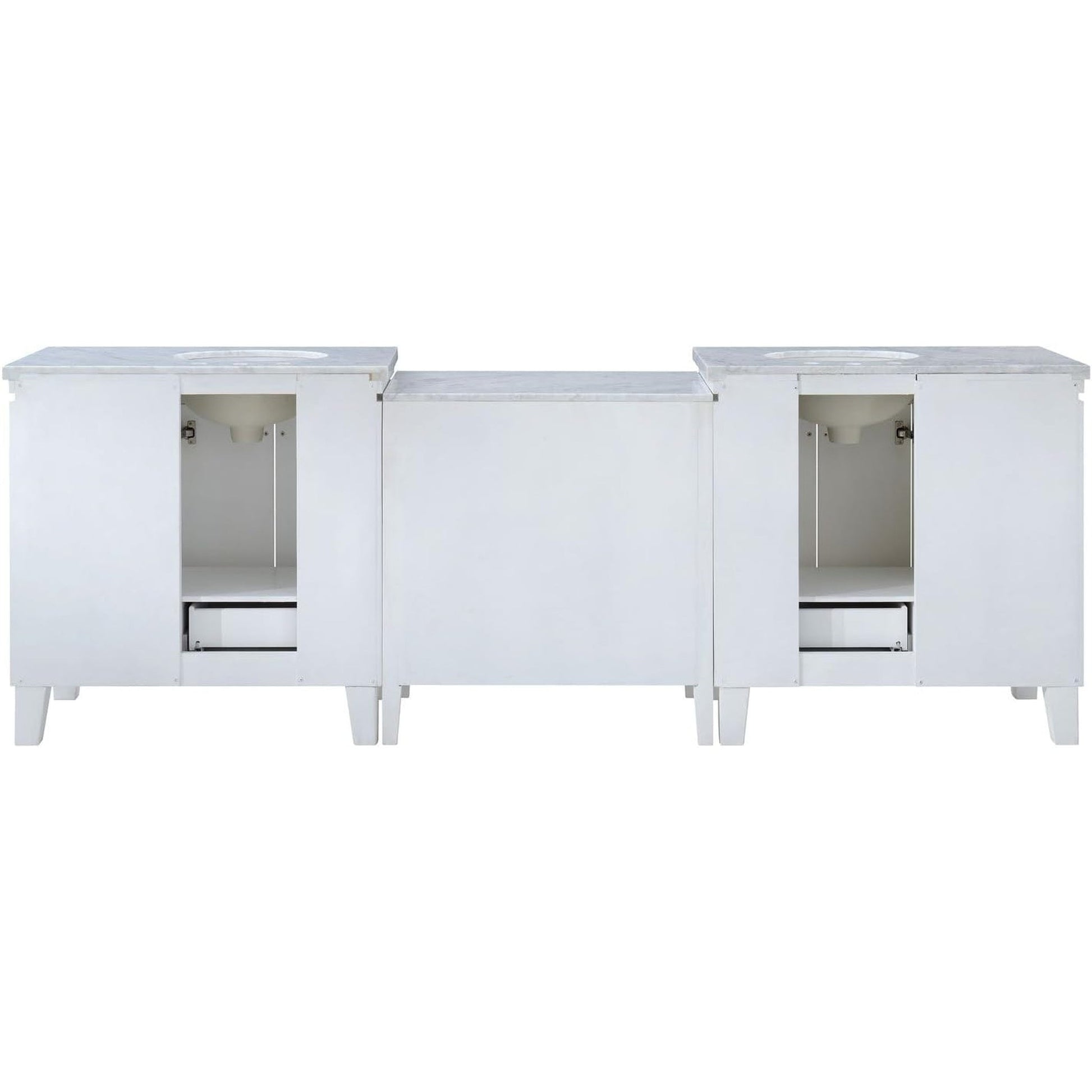 Elevate your bathroom with this stunning Silkroad Exclusive transitional vanity. Crafted with solid wood and CARB Ph2 certified panels, the dimensional frame is finished in white oak for a fresh look. The natural Carrara marble top adds a touch of sophistication and pairs well with any style of bathroom. This double sink vanity boasts nine drawers and four doors for ample storage space.