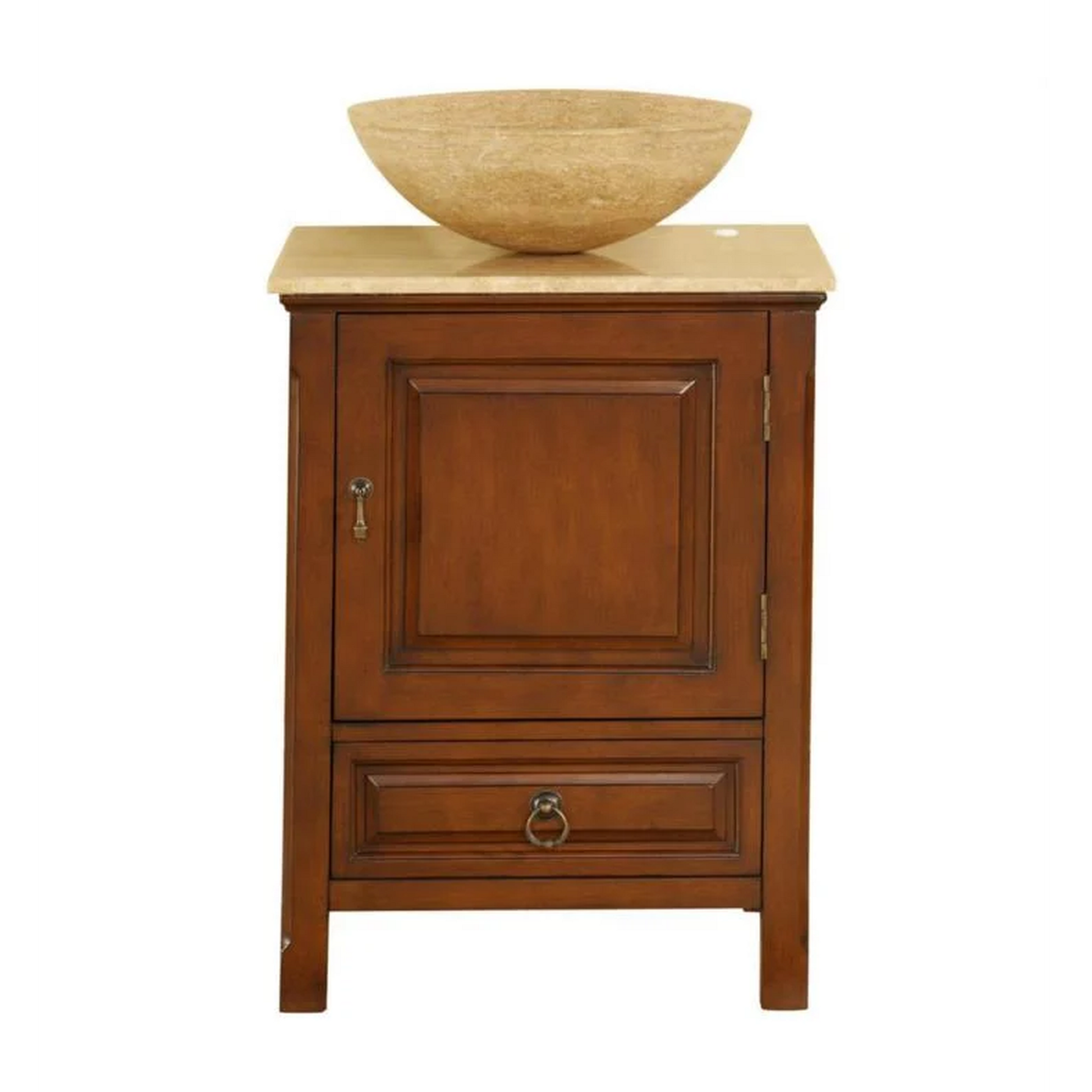 The Osaka 22" Single Sink Cabinet makes a bold statement. It features antique cherry finish and travertine countertop. Countertop is pre-drilled to accommodate a vessel bowl sink (sold separately). A single-hole faucet hole is also pre-drilled.