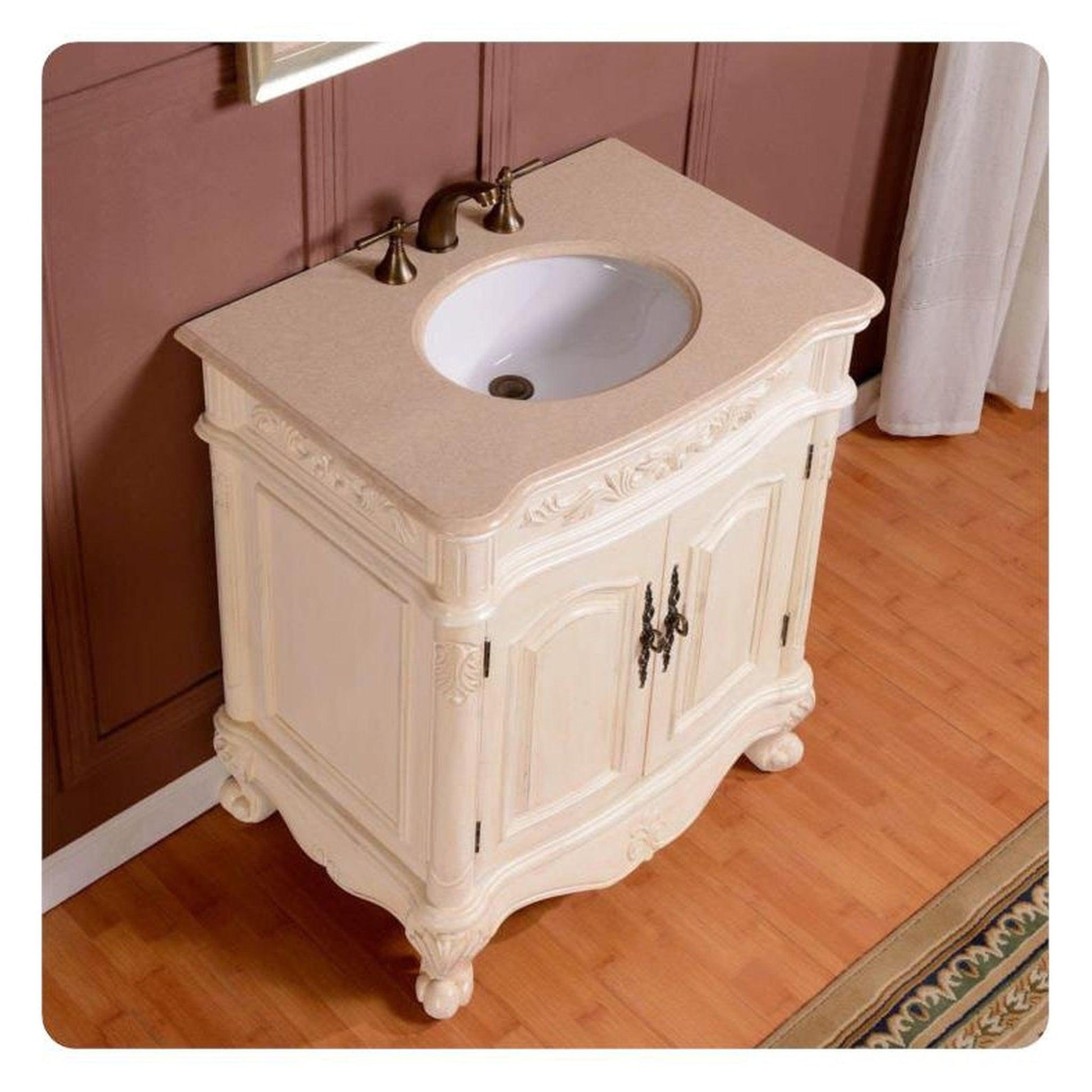 This elegant single sink bathroom vanity will brighten up any room, featuring our light creamy White Oak wood finish, complementary antique brass handles, classic carvings on the sides and doors and our natural cream marfil marble stone counter top with 3 holes pre-drilled to accommodate any standard 8" widespread faucet of your choice.