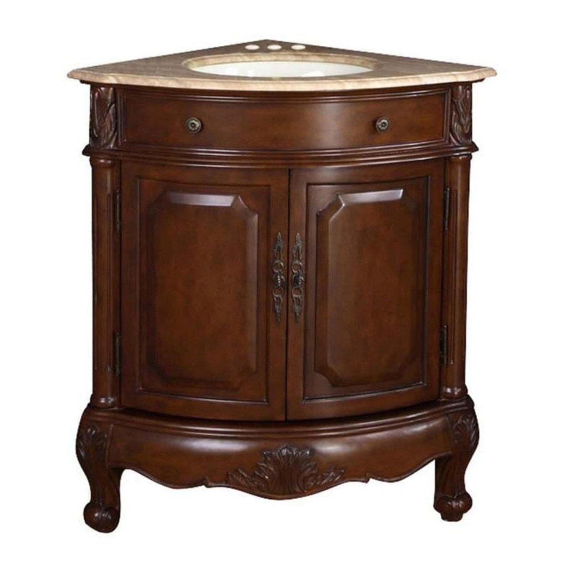 This English country style single sink vanity, sitting discreetly in the corner, features a detailed leaf design accentuating the edges. The wedge shaped cabinet will fit nicely into any standard 90Β° corner and will bring a unique touch to your bathroom remodel. This beautiful bathroom vanity comes with our rich Cherry finish, antique brass handles, white ceramic under mount sink and all natural solid travertine stone counter top. The stone is finished with a beveled edge around the exterior and bowl opening to add a subtle character while attracting attention to the gorgeous natural veining in the travertine.