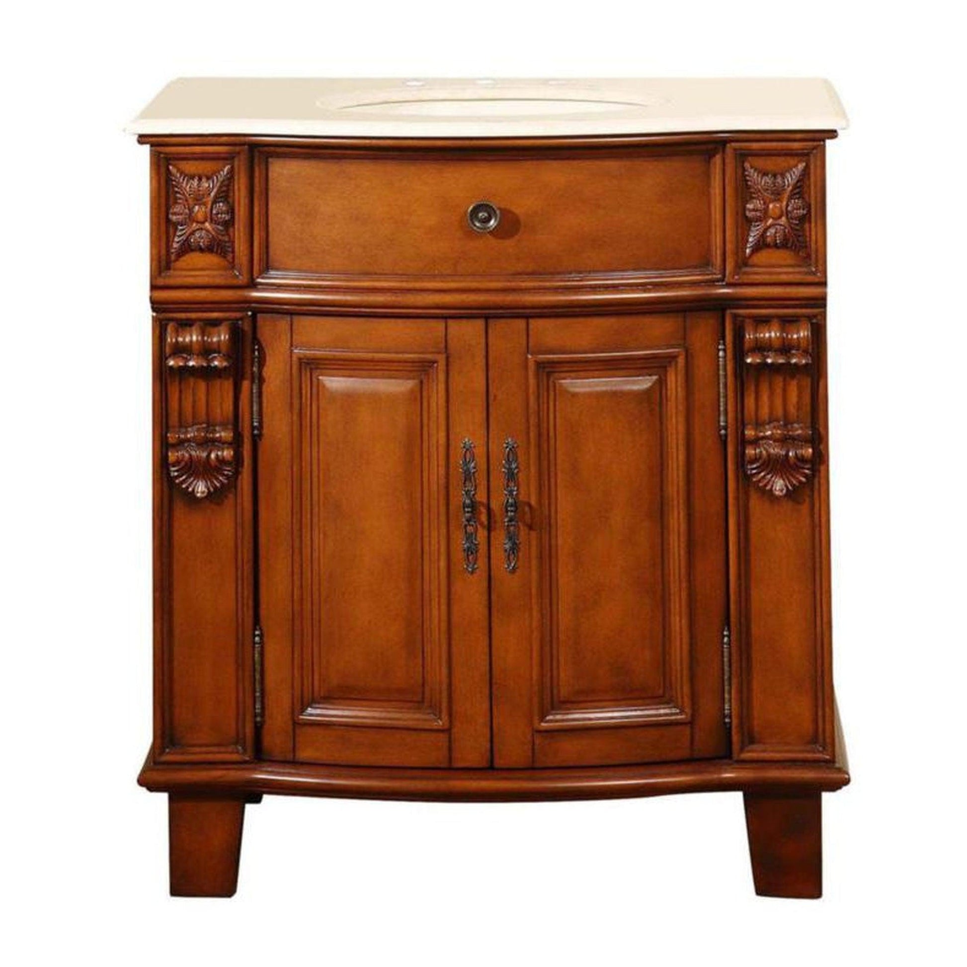 A: This vanity features a rich cherry wood base, a luxurious Crema Marfil marble countertop, and an ivory ceramic undermount sink, offering both durability and elegance.