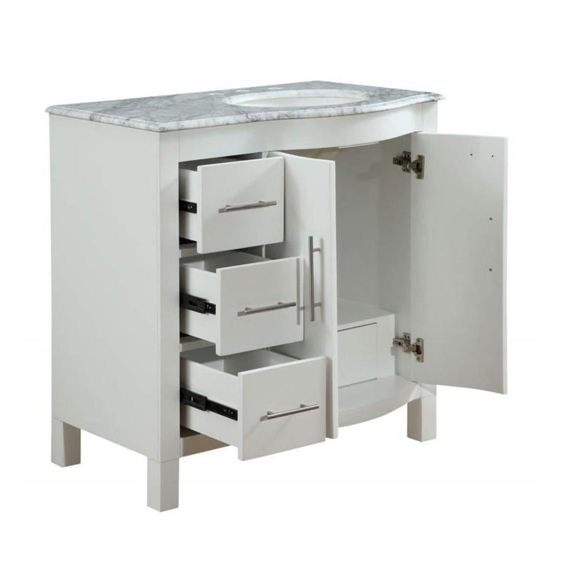 A: The Silkroad Exclusive V0290WW36R is a 36-inch single sink bathroom vanity featuring a classic white finish, a Carrara White marble countertop, and a right-offset white ceramic undermount sink.
