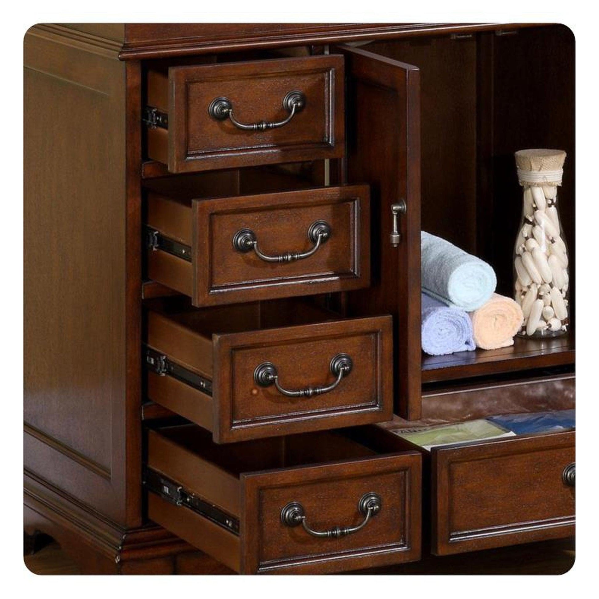 A: The vanity features a rich English chestnut finish, providing a warm, sophisticated feel that complements any bathroom design.
