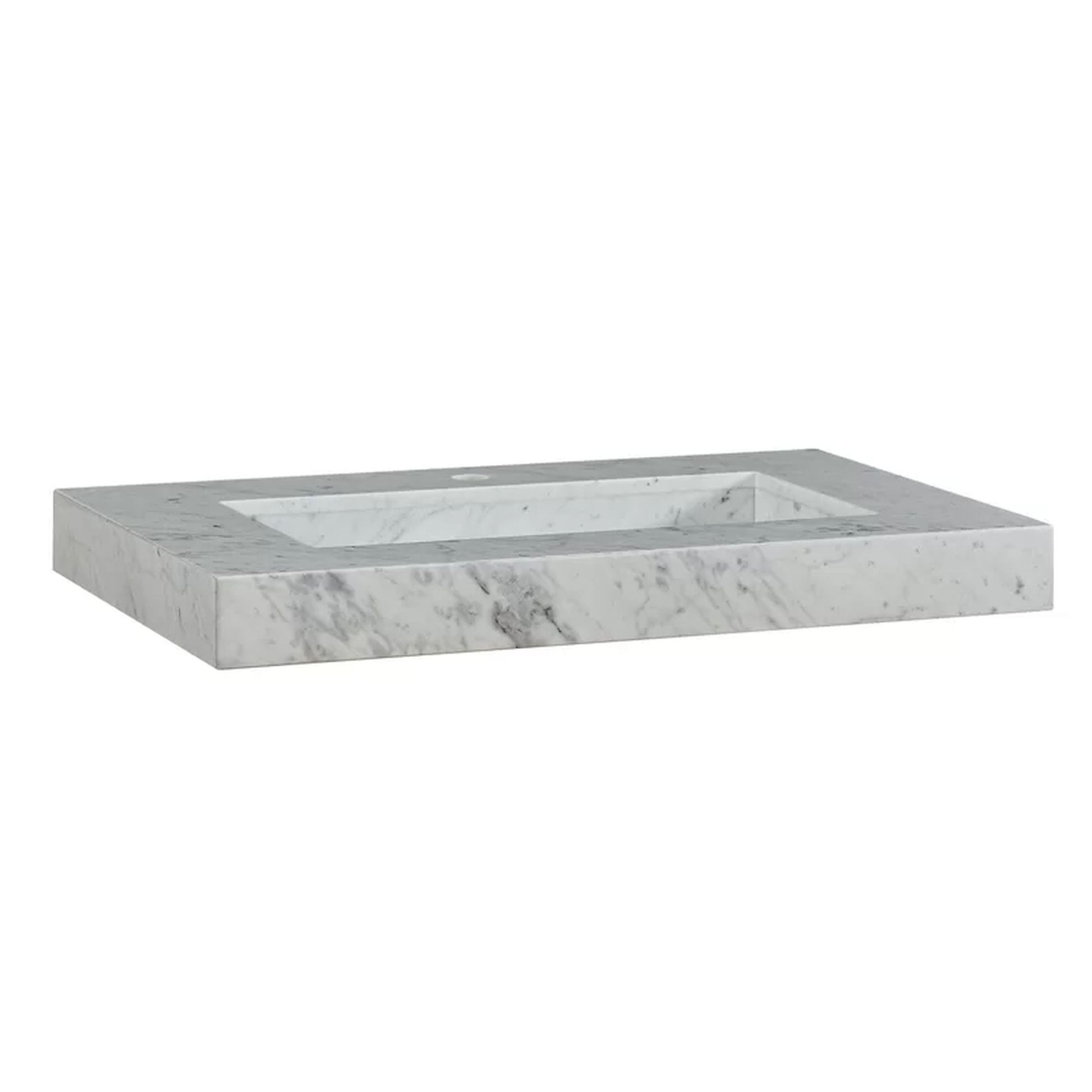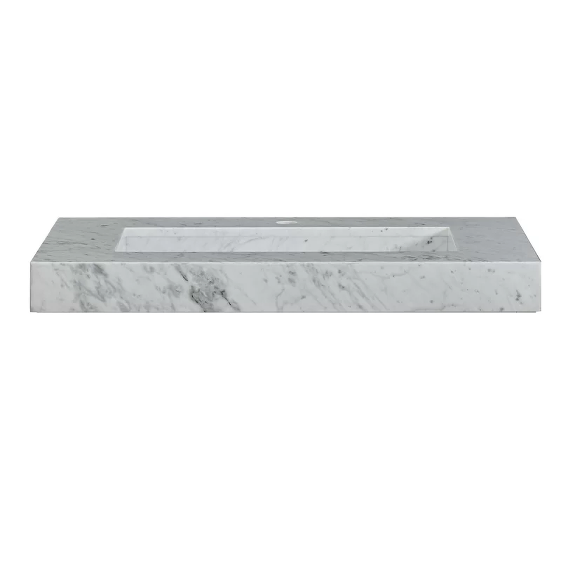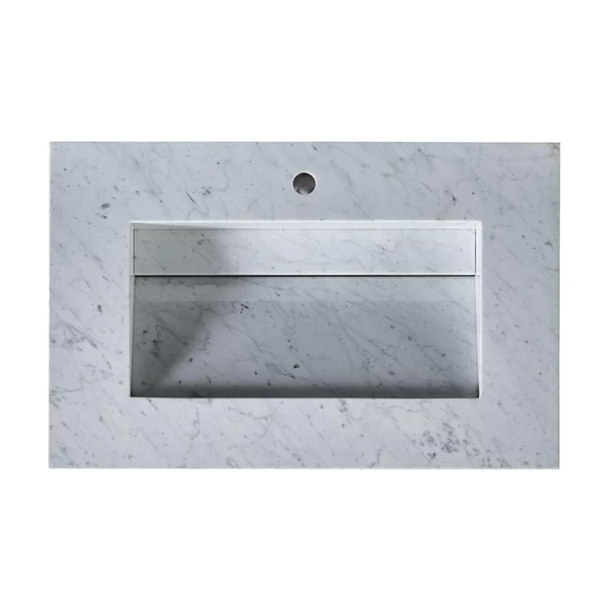 A: The vanity top is crafted from natural White Carrara marble, with an integrated rectangular ramp sink for a contemporary look.