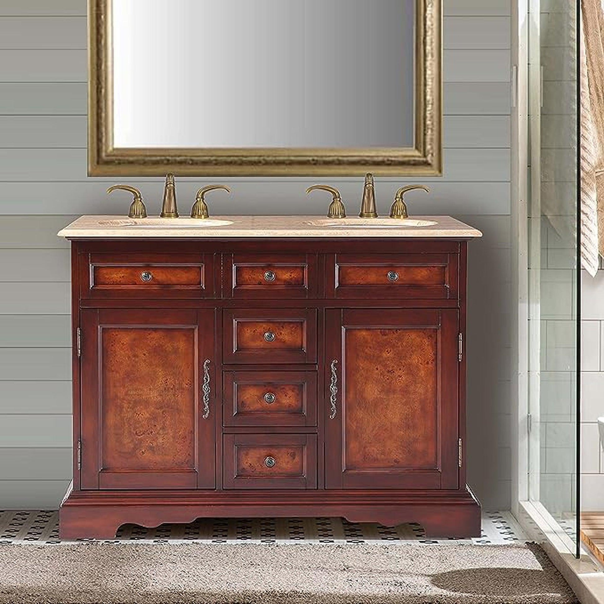A: The Silkroad Exclusive HYP-0716-T-UWC-48 is a 48-inch double sink bathroom vanity featuring a rich Red Chestnut finish, a natural travertine countertop, and two white ceramic undermount sinks.