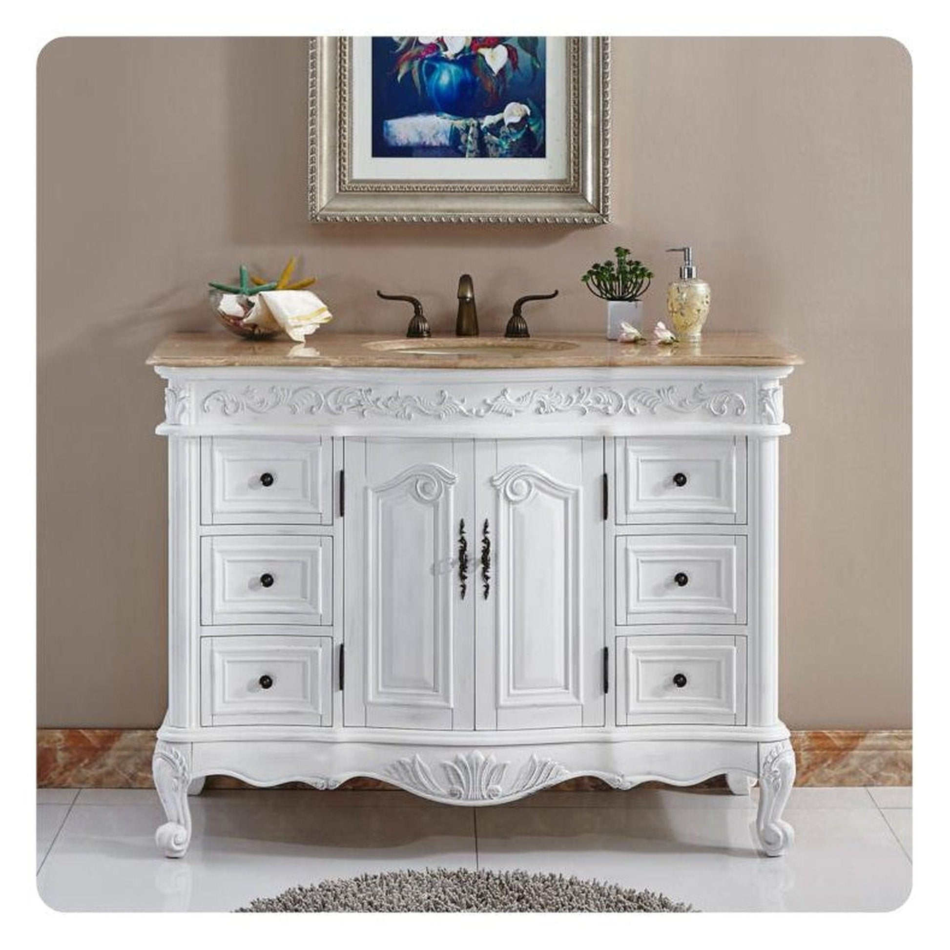 A: The antique white finish and travertine countertop give this vanity a timeless, classic look that suits traditional, transitional, and even some modern bathroom styles.