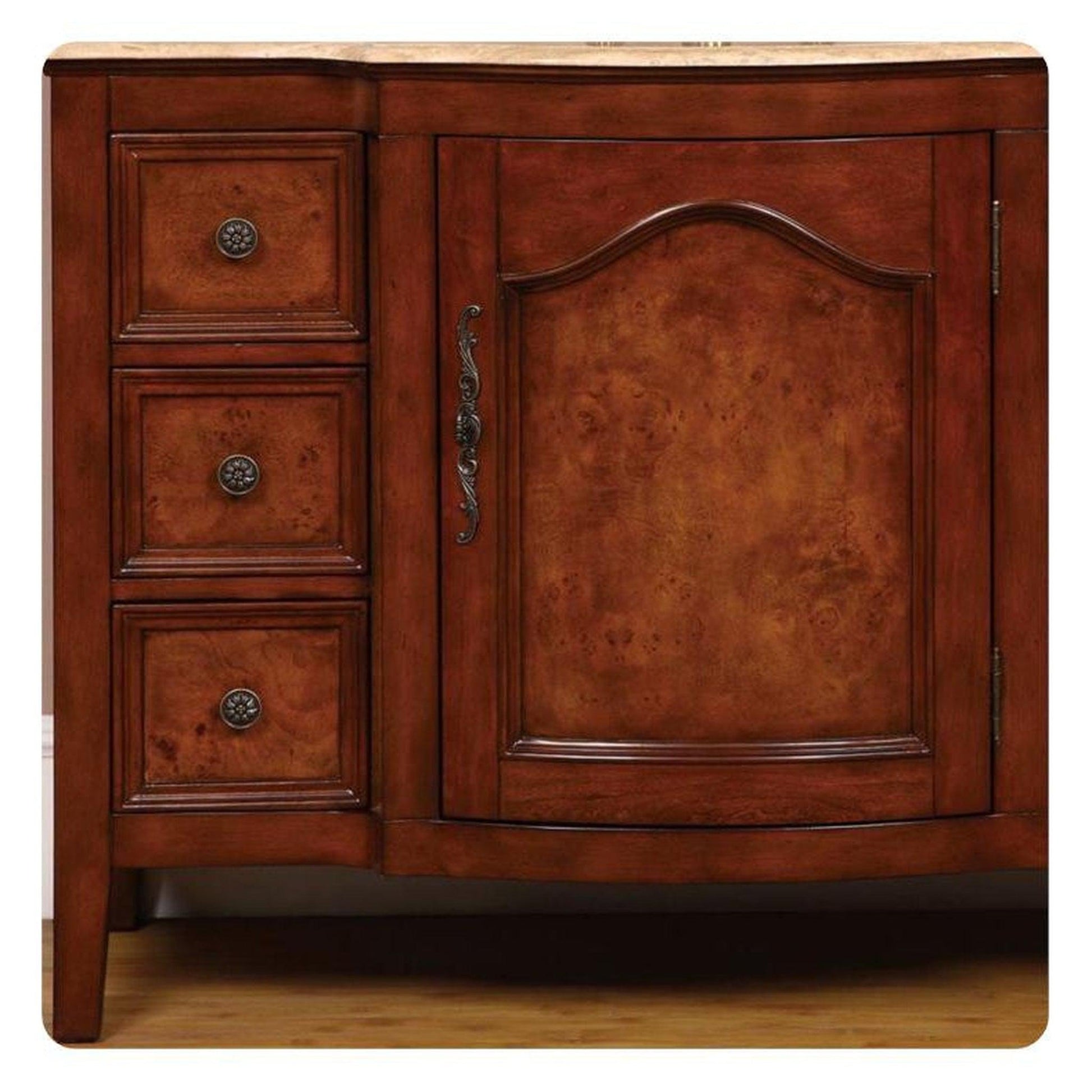 This marvelously vintage bath cabinet featuring antique brass handles, sturdy framework and plenty of storage space. The simple yet stylish design of this vanity will bring appeal to any bathroom and our all natural solid travertine stone counter top will entice your guests for years to come with its gorgeous natural stone pattern, formed long ago by tidal forces and immense pressures deep within the Earth.