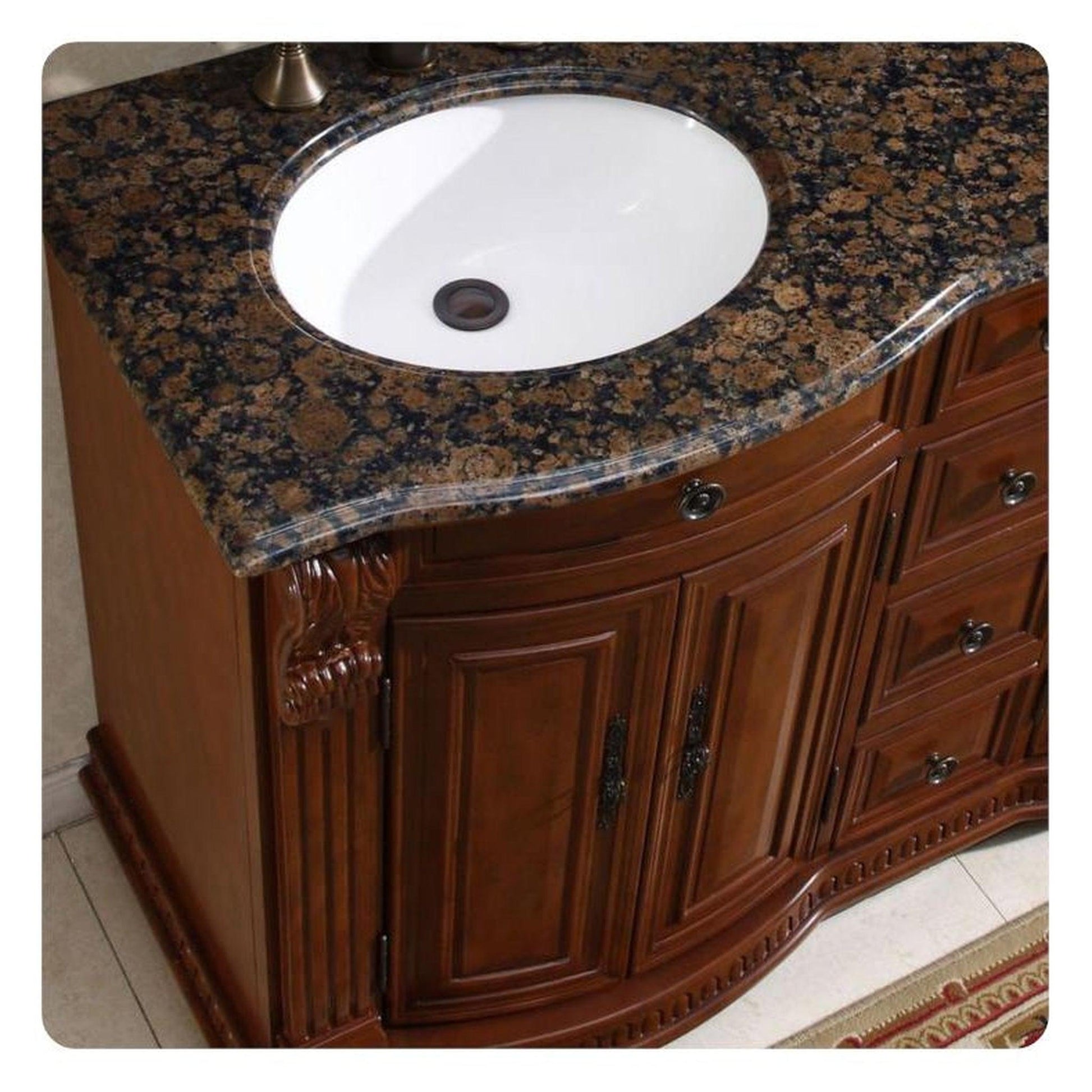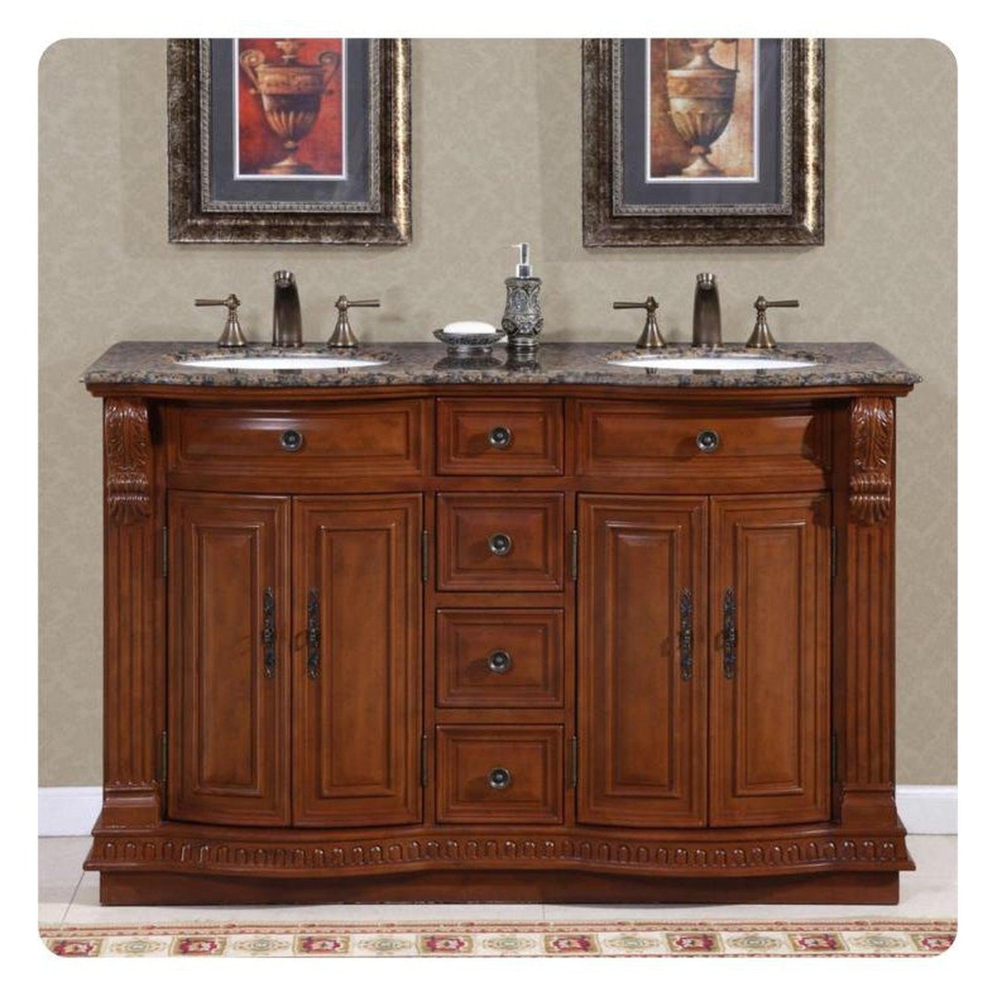 The magnificent Empire style of this elegant double sink bathroom vanity will give any bathroom the attention and appeal that it deserves. Our rich Cherry cabinet finish matches well with the deep natural coloring of the granite stone, which is finished with a beveled edge around the exterior and bowl opening. This transitional styled vanity bath cabinet will easily add a touch of sophistication and functionality to any decor.