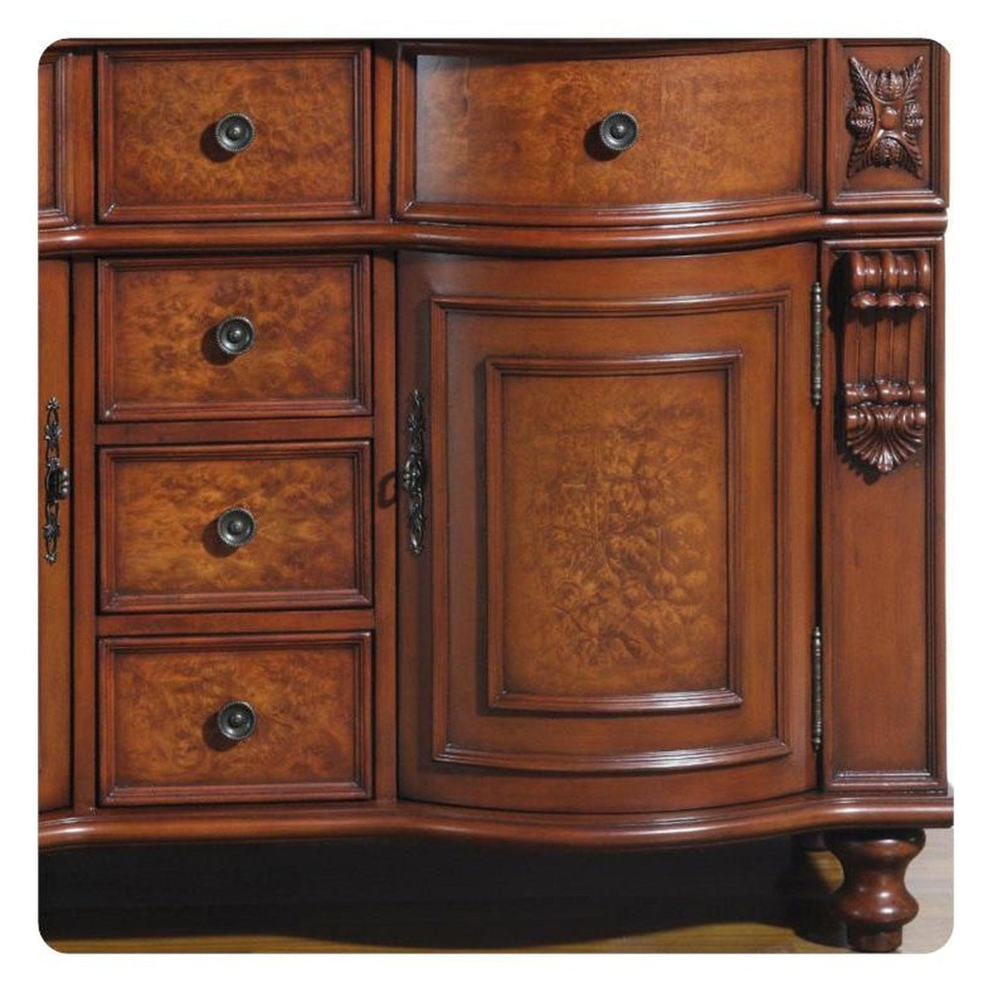 This charming colonial style double sink vanity will create a peaceful and relaxing atmosphere in any style bathroom. With detailed decor throughout the cabinet to accentuate the sturdy profile, a rounded leading front edge that creates graceful curve of both the stone and wood cabinet, rich Natural Cherry finish cabinet, blunt arrow feet to support the steadfast construction, this double sink vanity will be a wonderful companion for any bathroom. Inner frames along the cabinet front and doors with contrasting colors and veneer finish add a contemporary touch to a transitional style.