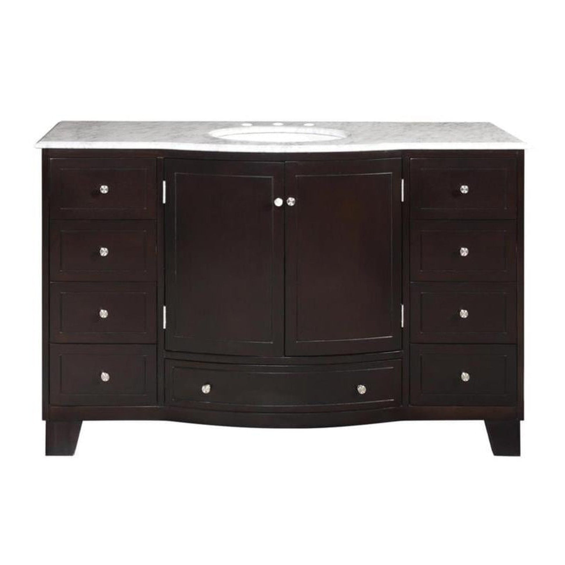A: The Silkroad Exclusive HYP-0703-WM-UWC-55 is a 55-inch single sink bathroom vanity featuring a sleek Dark Espresso finish, a luxurious Carrara White marble countertop, and a white ceramic undermount sink.