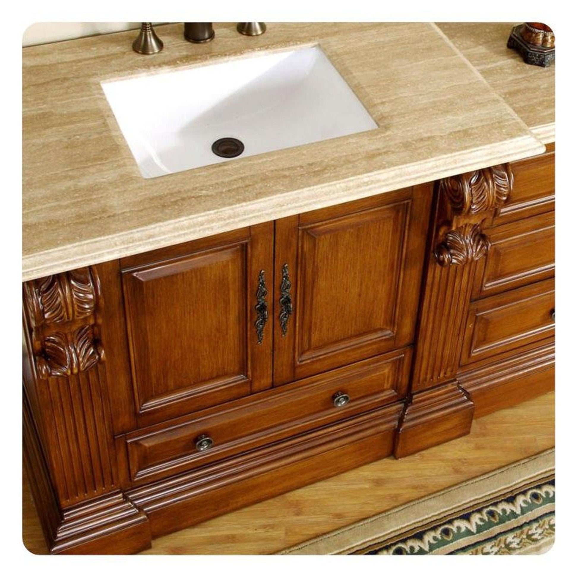 A: The vanity features a durable cherry wood frame, a luxurious travertine countertop, and a white ceramic undermount sink for a classic, high-end look.