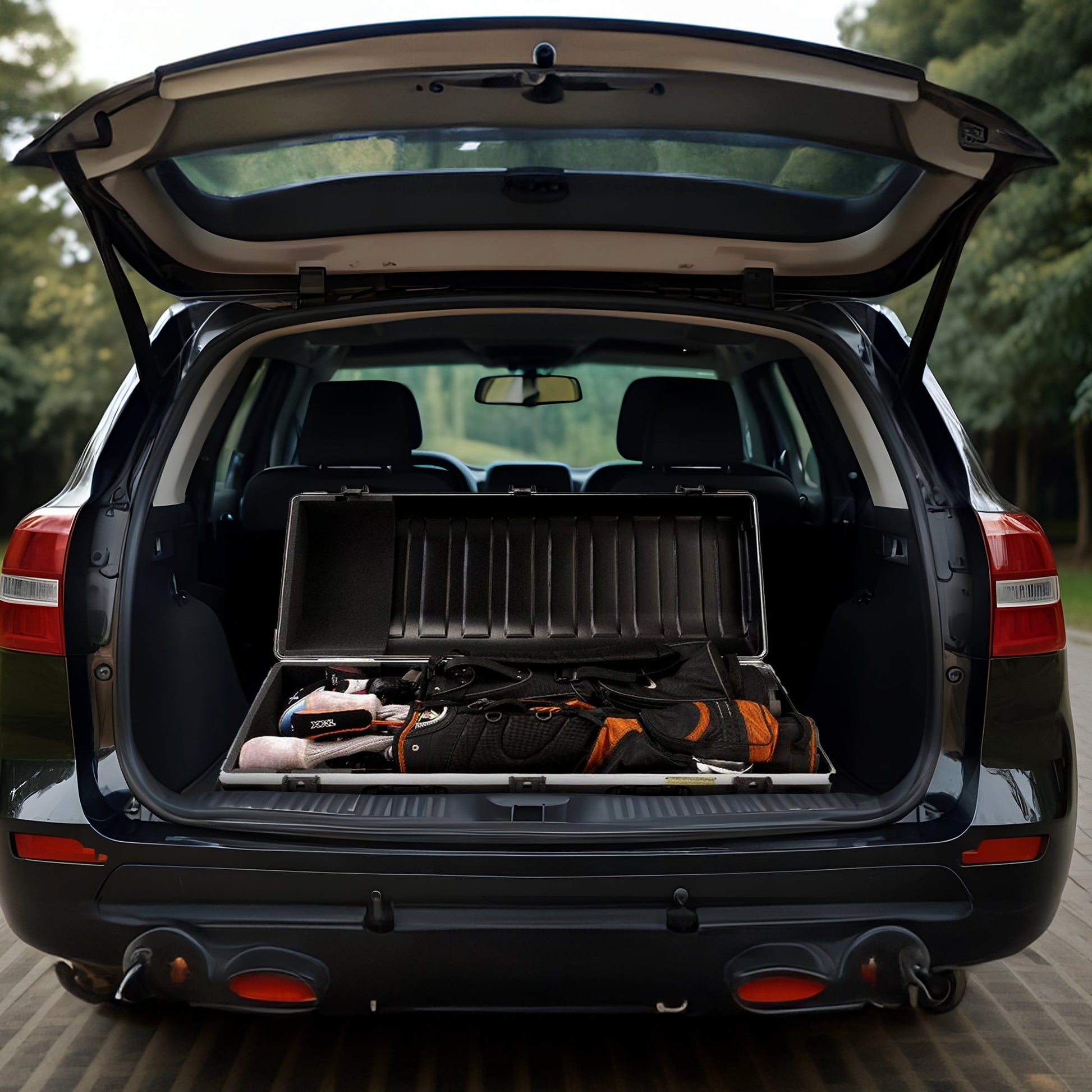 A: It accommodates two standard or oversized golf bags with additional space for accessories.