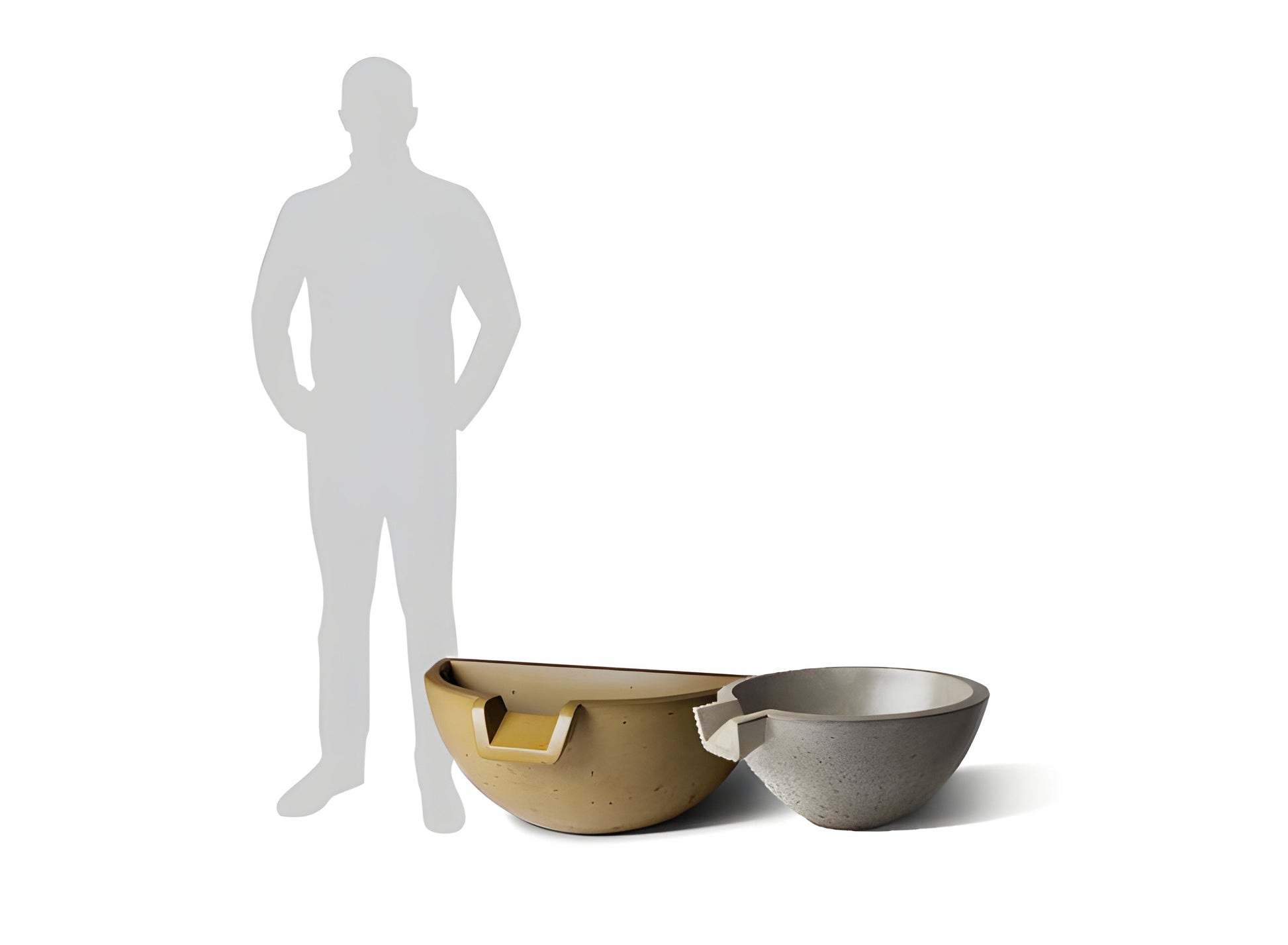 A: It's a high-quality, durable concrete water bowl designed with a sleek copper spillway for a stunning water feature in any outdoor space.