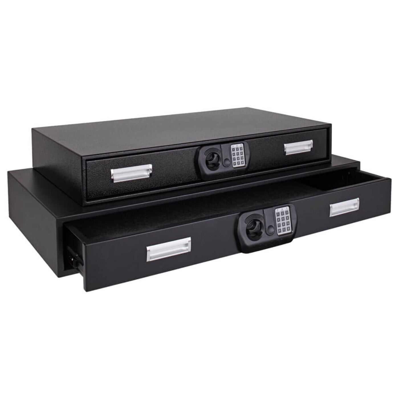 Unique from other Under Bed Safes, the SnapSafe version is similar to that of a drawer where the entire tray with the door pulls out. On the face of the safe is an easy to use and easy to program electronic lock with a turn knob. Once the knob is turned and the internal bolts are retracted, your tray easily slides out. A key backup is included for emergency scenarios or in the event the batteries die.