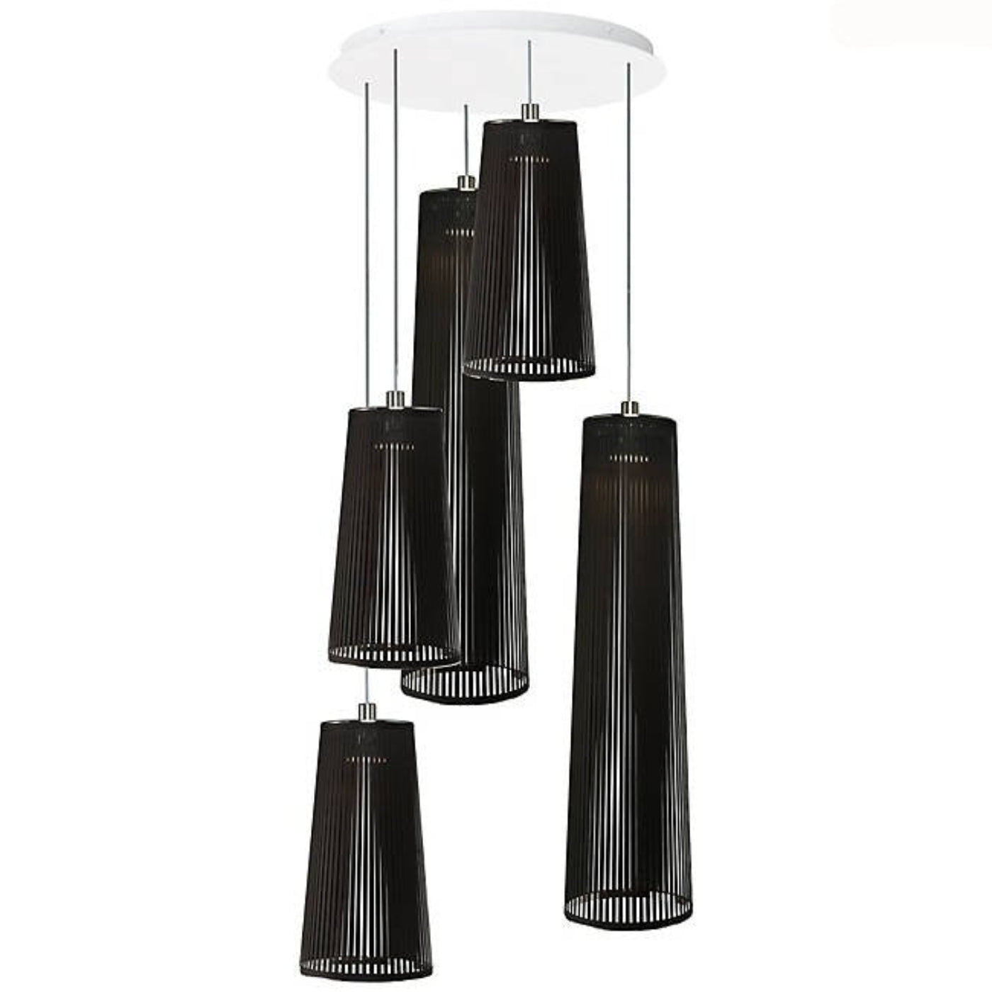 Striking Modern Form – A dramatic five-shade chandelier that blends light and shadow for a sculptural centerpiece.