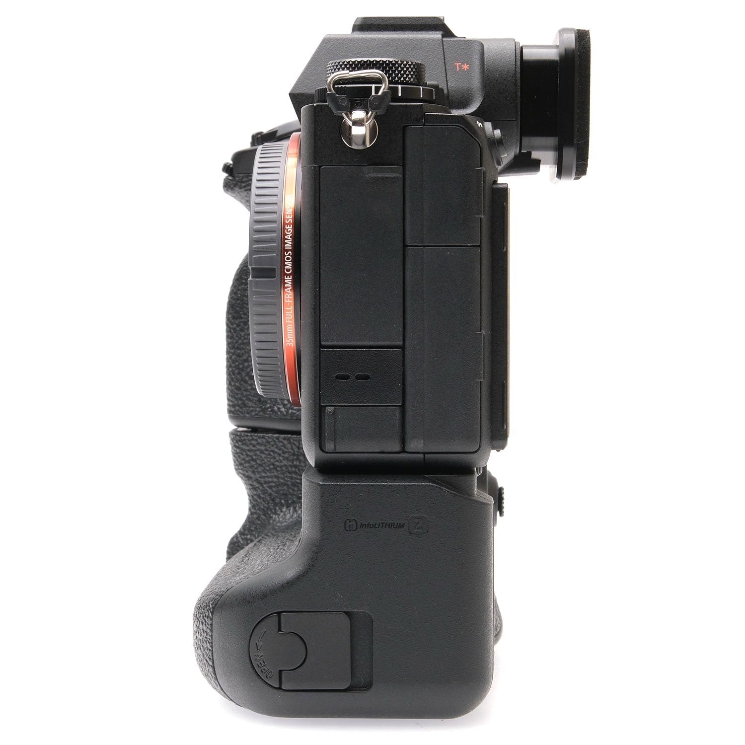 This Sony Alpha 1, #3373108, is in great condition with minor handling wear. I rate it cosmetically a (9). It has approximately 12,000 shutter actuations. The camera is in proper working order; the viewfinder is clear, the sensor is unmarked, and the memory card slots read & write. The included Sony VG-C4EM Vertical Grip, #3340706, is in similar condition, also rated a (9). This camera also includes a Sony battery, battery charger, charging cable, and body cap. No standard battery door is included. Please refer to the photos for details.