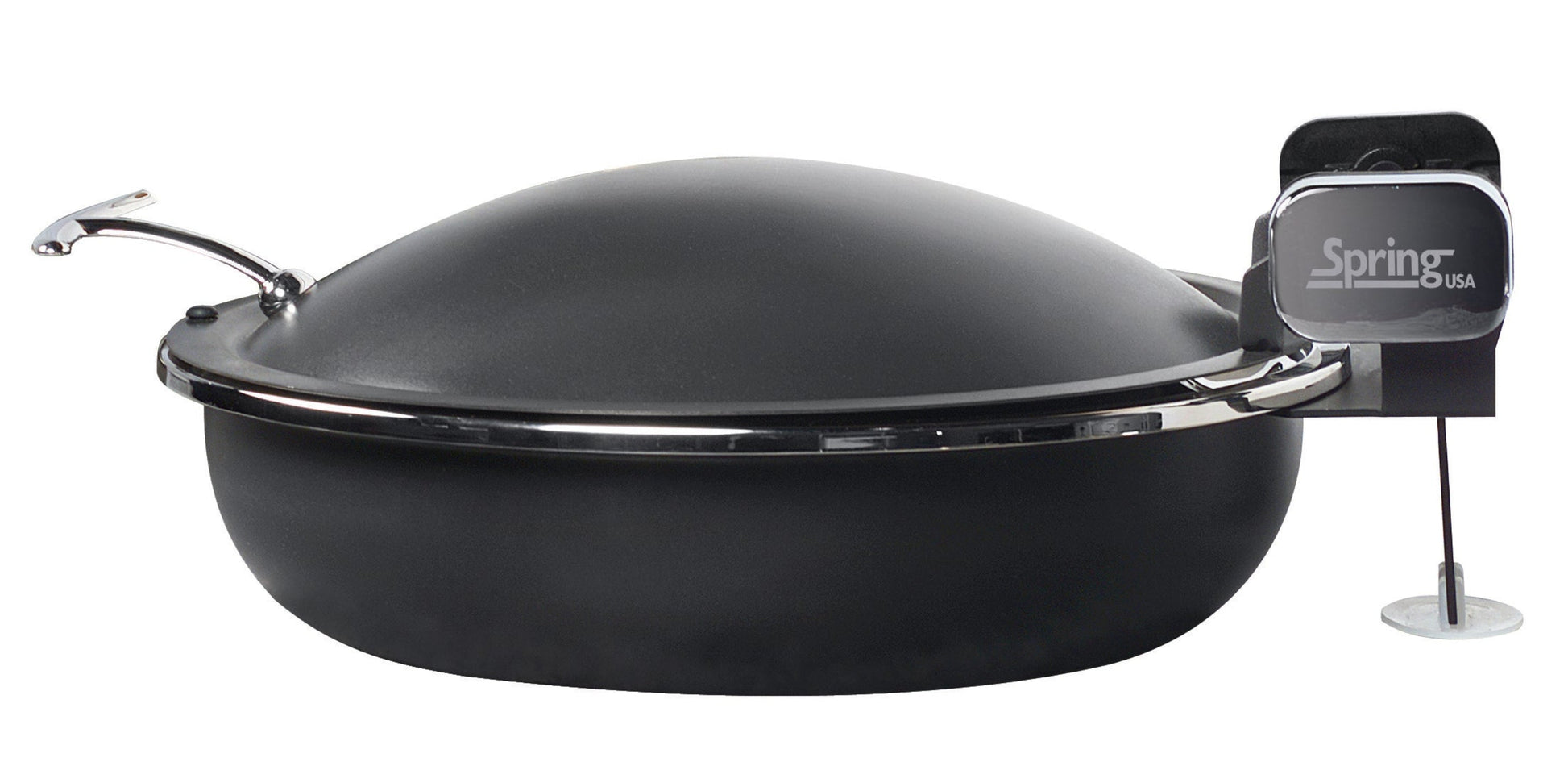 A: The Spring USA 2382-8/36 is a 4-quart, round induction-ready buffet server featuring a titanium-colored high-temperature coating with chrome accents, designed for stylish and efficient food presentation.